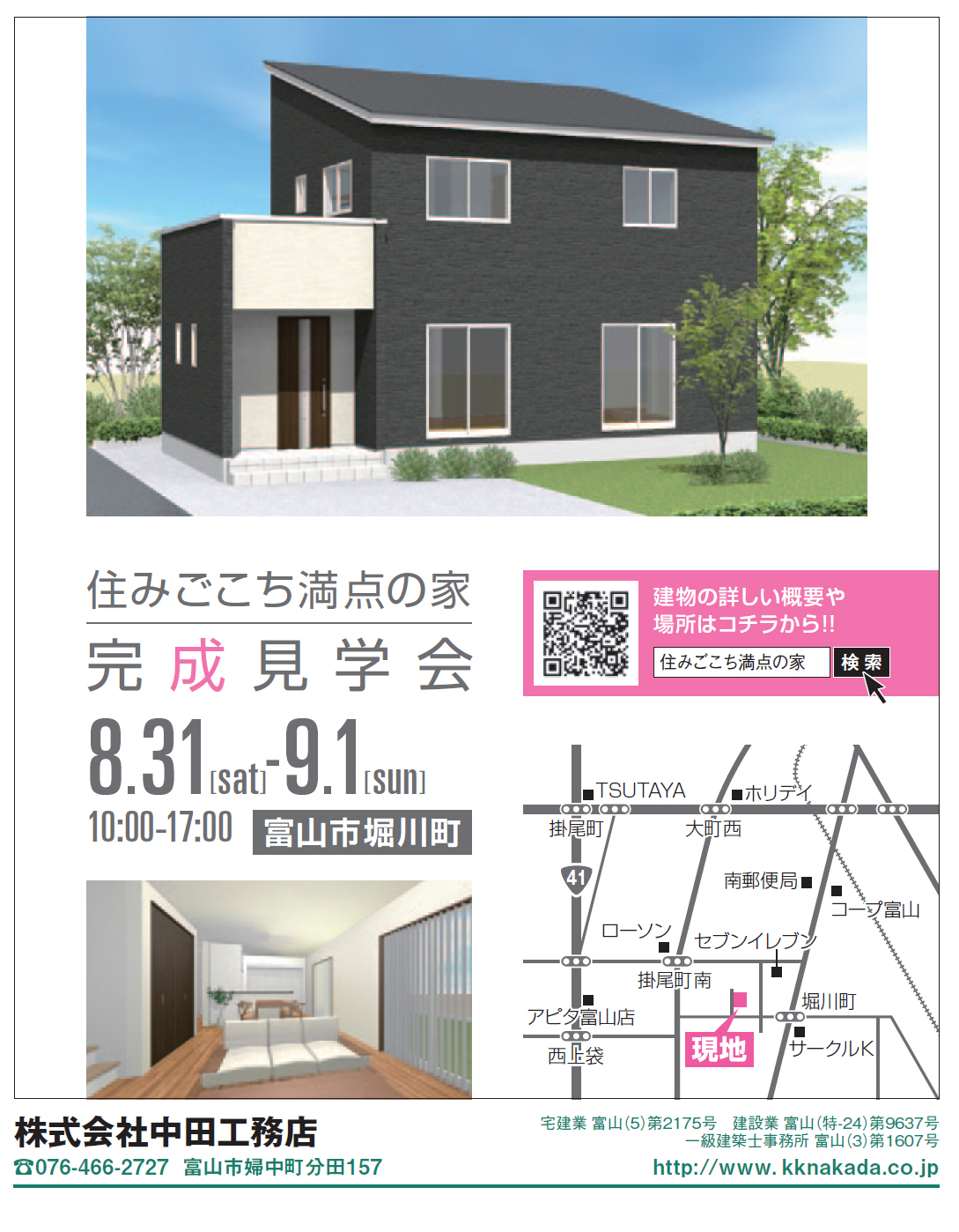 8月31日(土)、9月1日(日)の2日間、富山市堀川町「住みごこち満点の家」完成見学会を開催します!