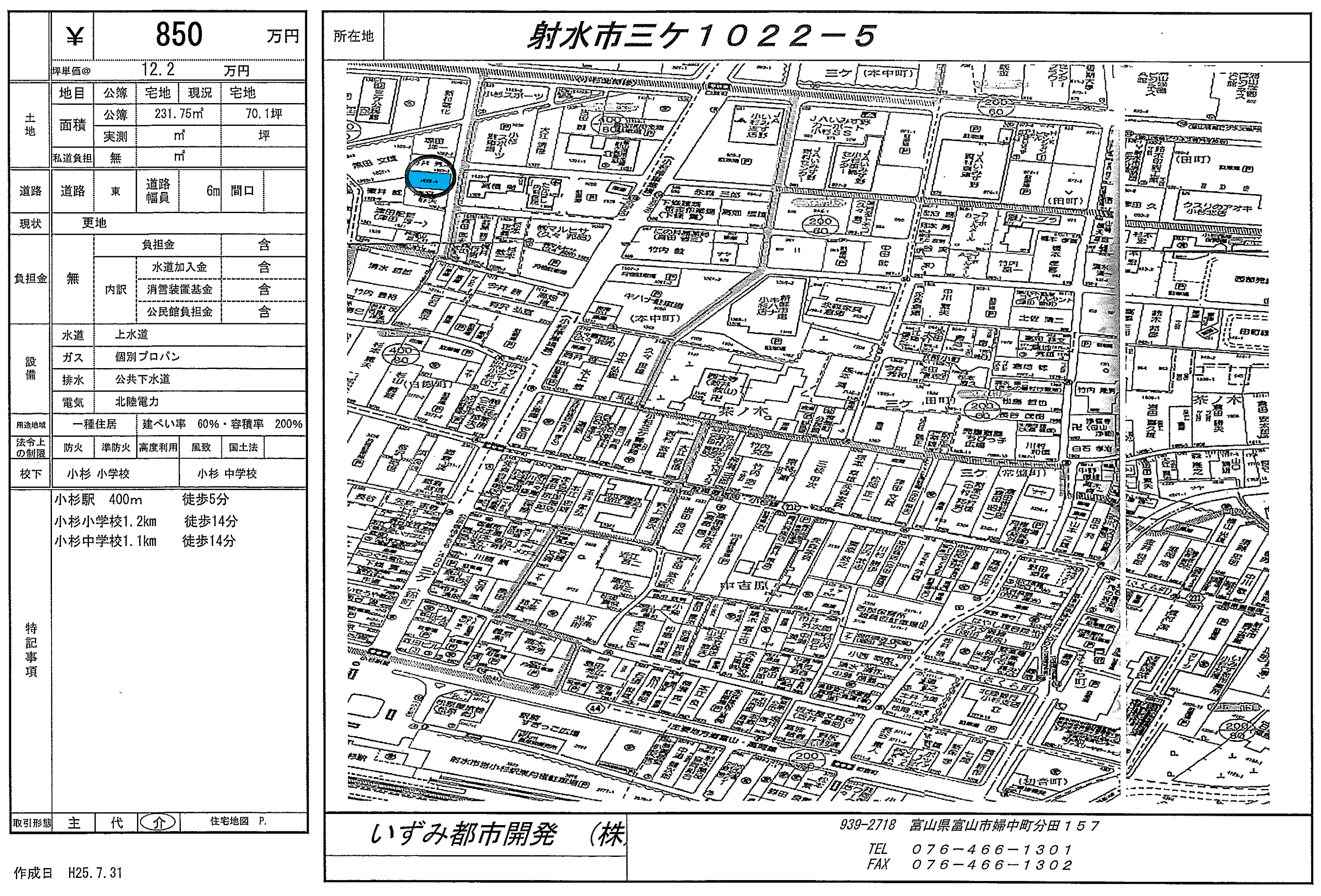 富山県射水市三ヶ(小杉駅近く)の土地です。北陸本線小杉駅徒歩5分のアクセス、坪単価12.2万円の土地です。