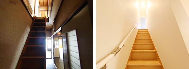 急な勾配の階段も出すり付の上りやすい階段にリフォームしました。