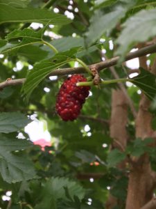桑の実 2018.06.10 桑の実です。 僕が神童と言われていた頃(小学生ぐらい)の話です。 養蚕が盛んだった名残りで、通学路の途中には結構桑畑がありました。 社会科の授業では桑畑の地図記号も教わりました。 理科の授業では蚕の飼育で、桑の葉も準備しました。 桑の実もよく食べていました。甘くて美味しいのですが、舌が紫色になったものです。 最近では桑の木もなかなか見る事も少なくなりましたが、工場の裏に勝手に生えてきた木に なった桑の実です。