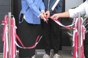 先日、お施主様邸で引渡し式が行われました。当日は朝からあいにくの雨でしたが、無事に鍵の受け渡し、テープカットを終えることができ、社長、現場監督からそれぞれの挨拶と、お施主様より感謝のお言葉を頂戴いたしました。