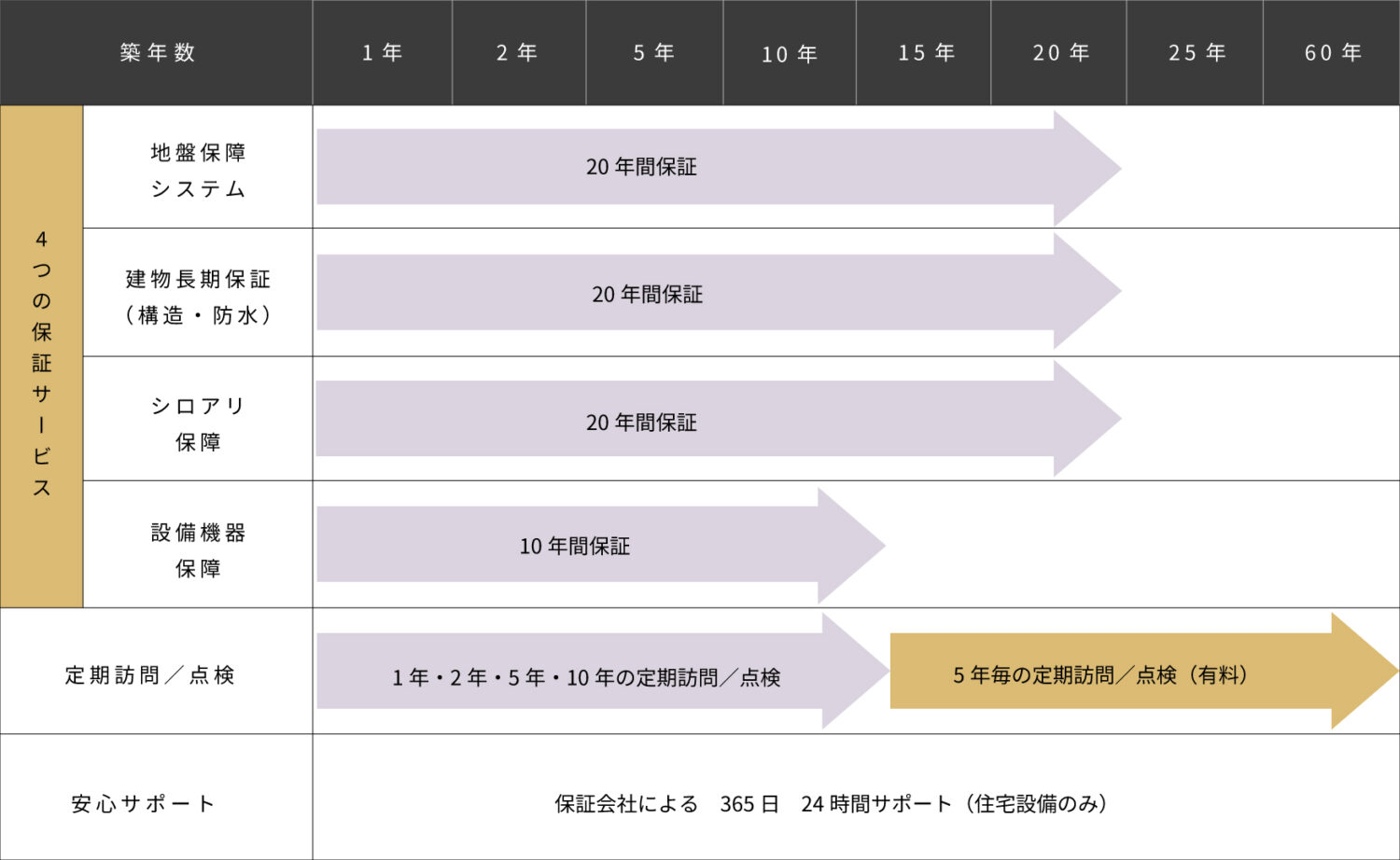確かな住宅性能と定期的な点検・メンテナンスにより初期保証20年をご提供します。建物品質保証では構造耐力上主要な部分や雨水の侵入を防止する部分の品質を保証します。