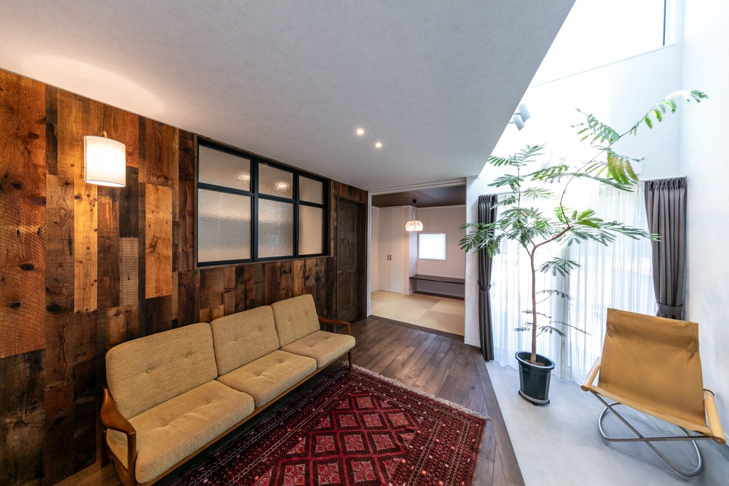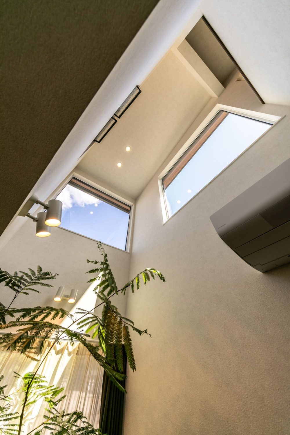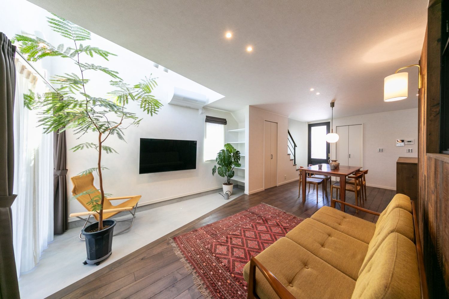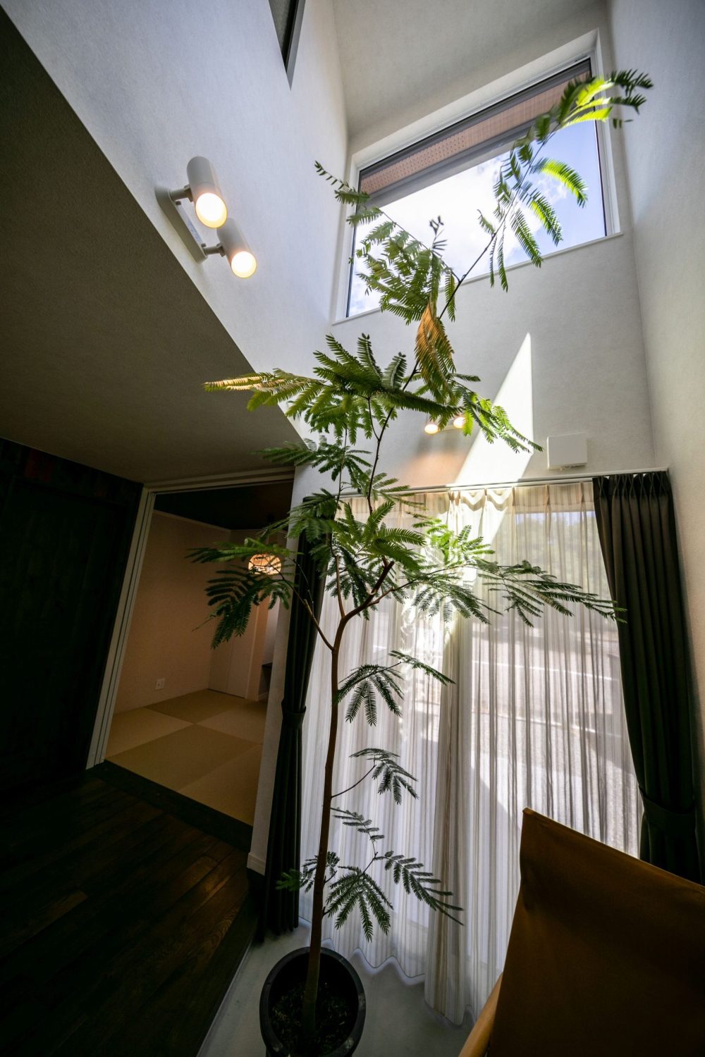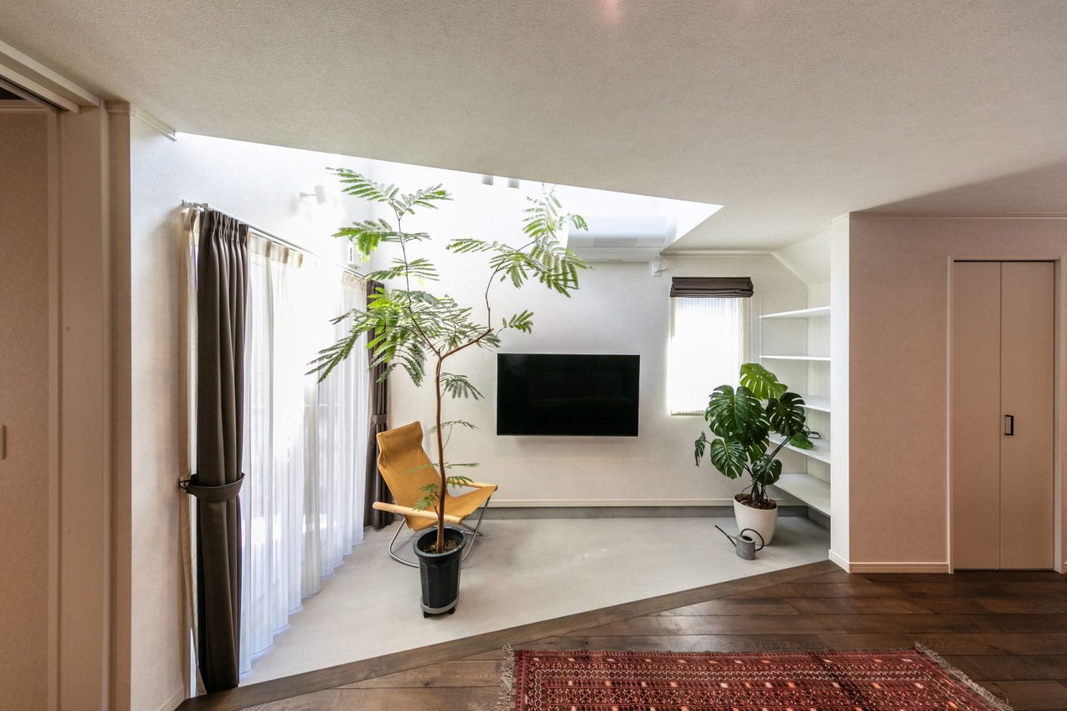 リビングに座れば、吹き抜けからの明るい日差しと緑の借景が心地よい、静けさと緑に包まれる特別な住環境です。