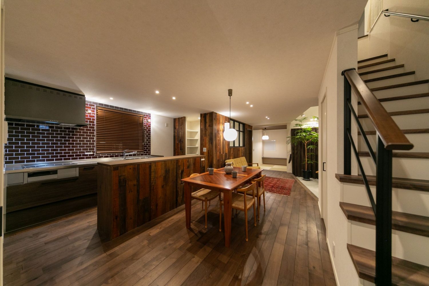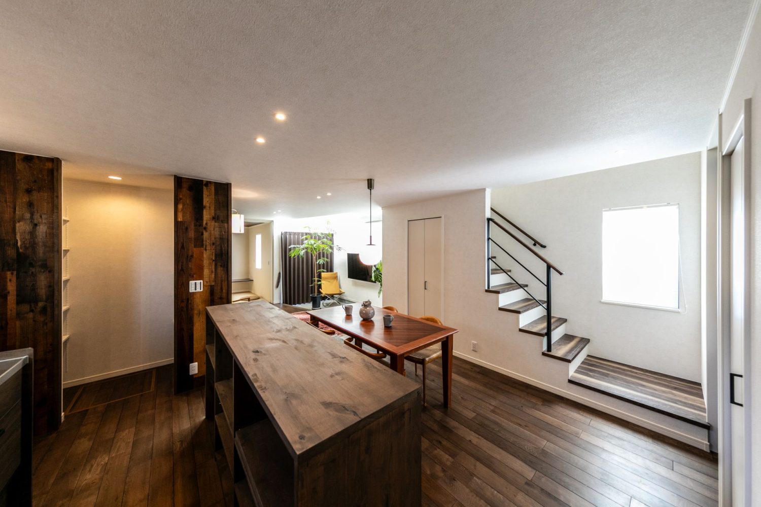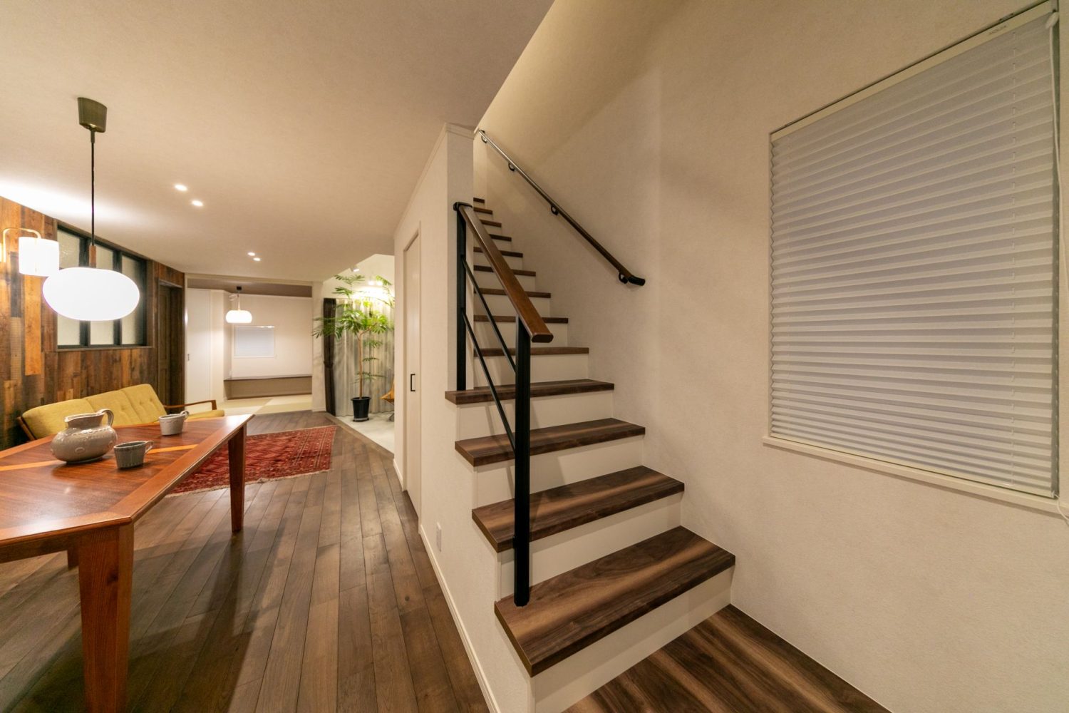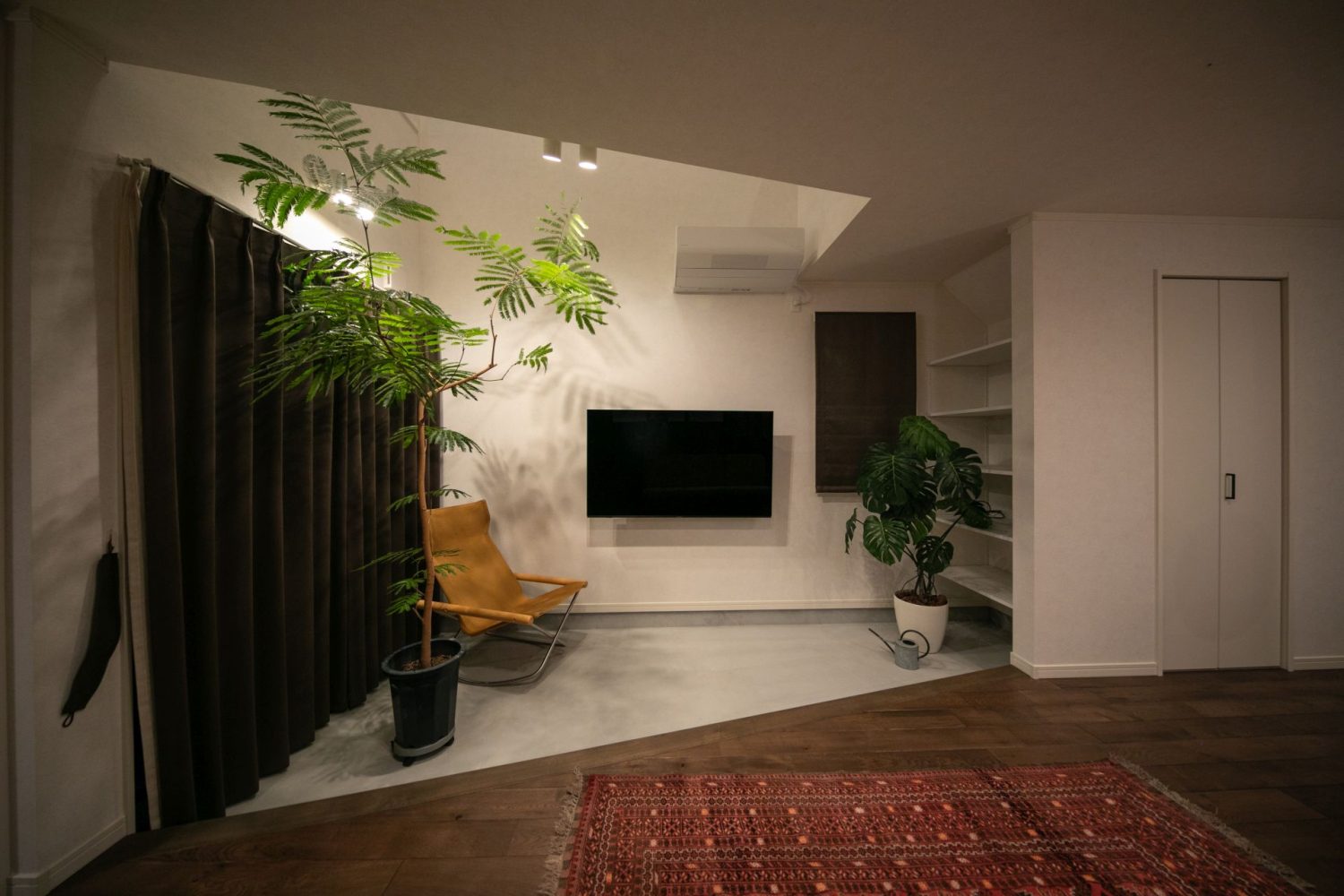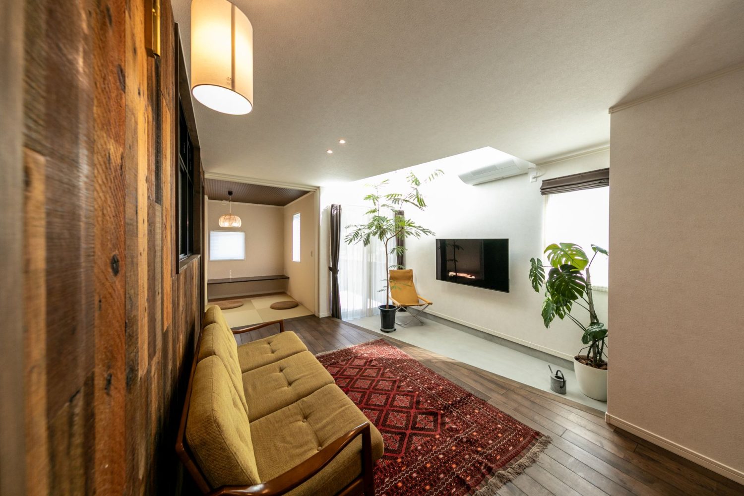 リビングに座れば、吹き抜けからの明るい日差しと緑の借景が心地よい、静けさと緑に包まれる特別な住環境です。