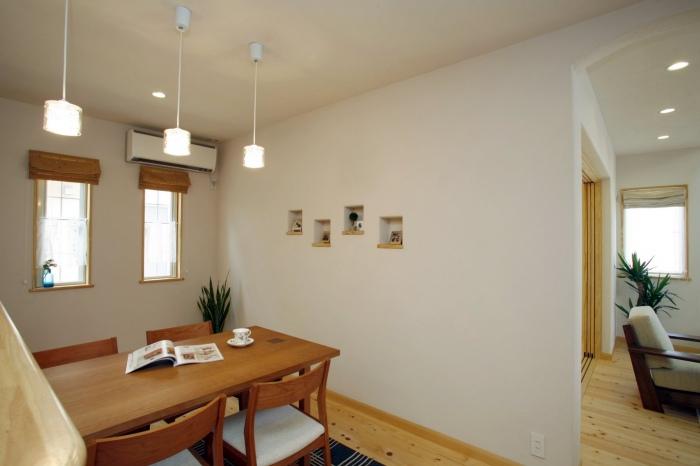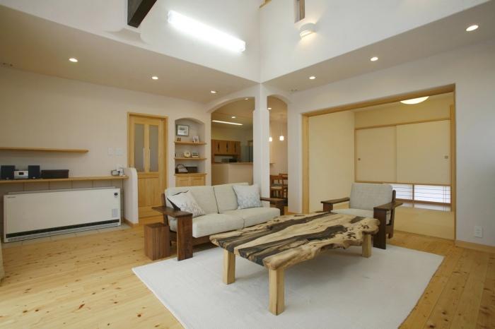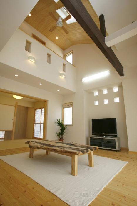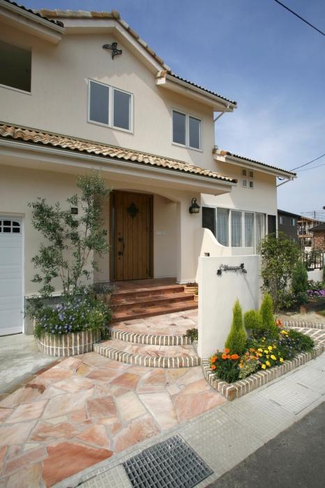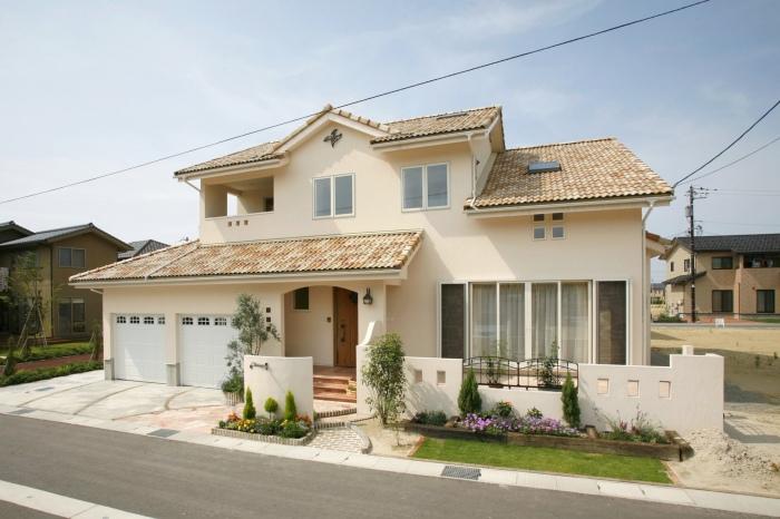 ナチュラルな色彩に2色のカラーを散りばめた瓦。温かみの感じられる、明るい色調の塗り壁。