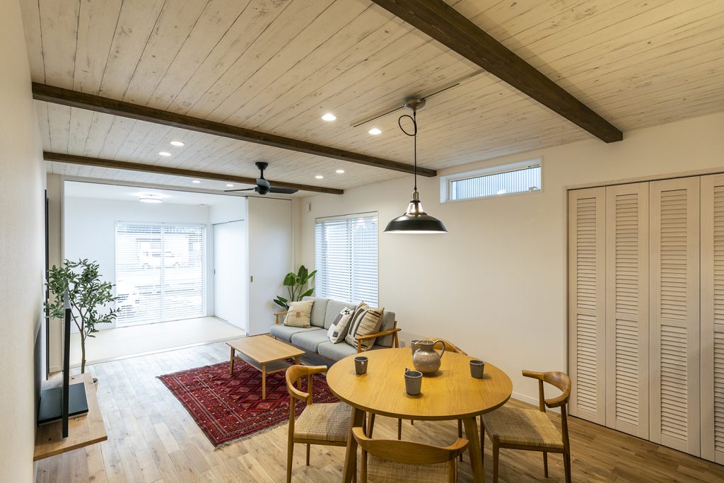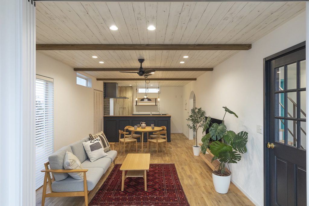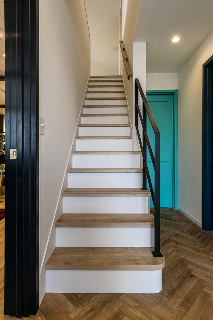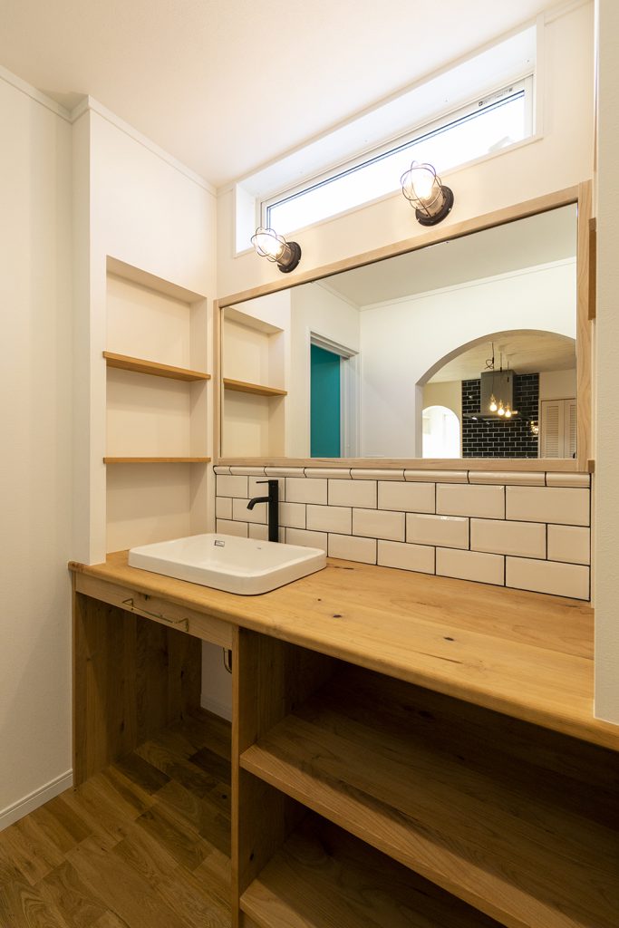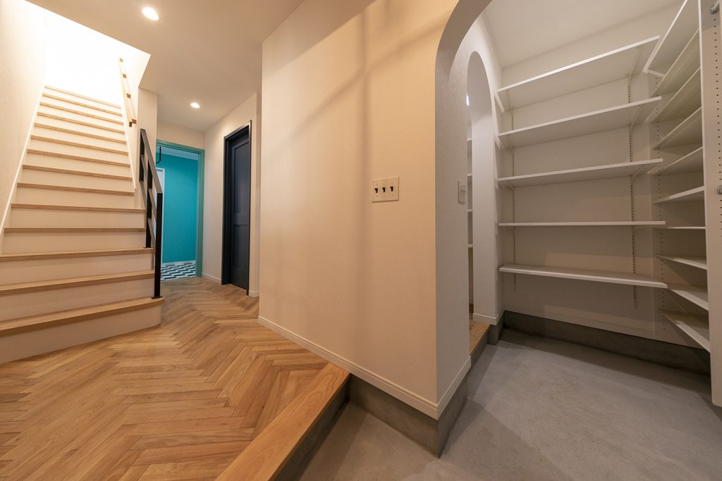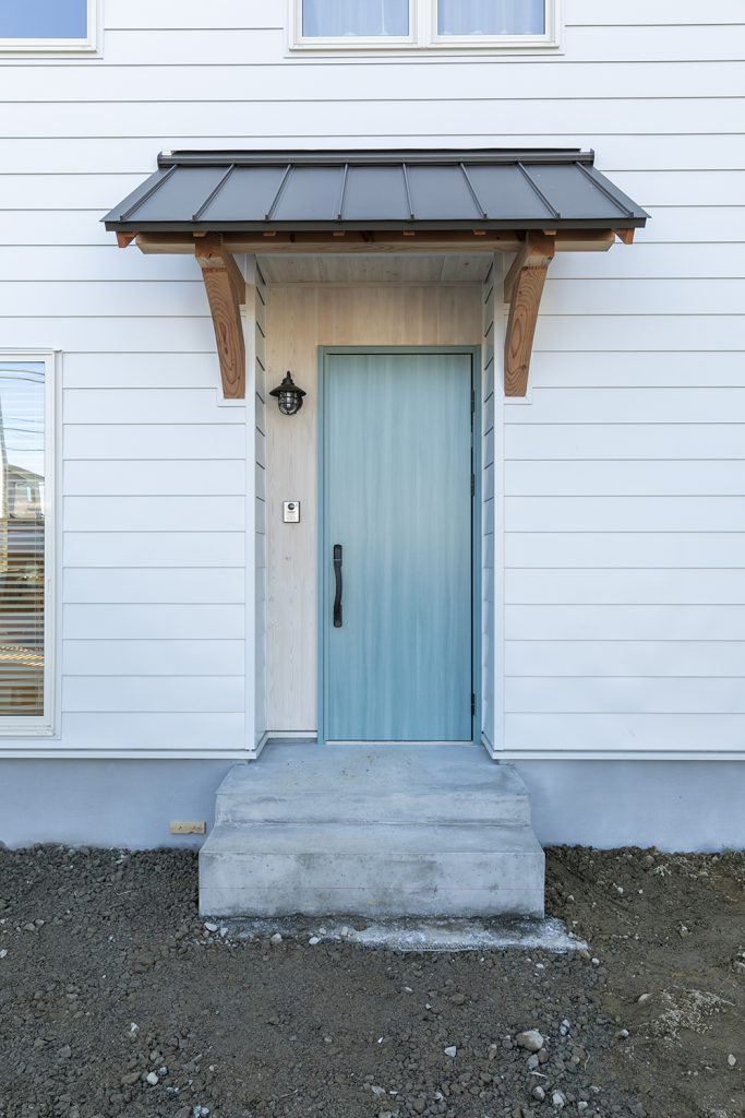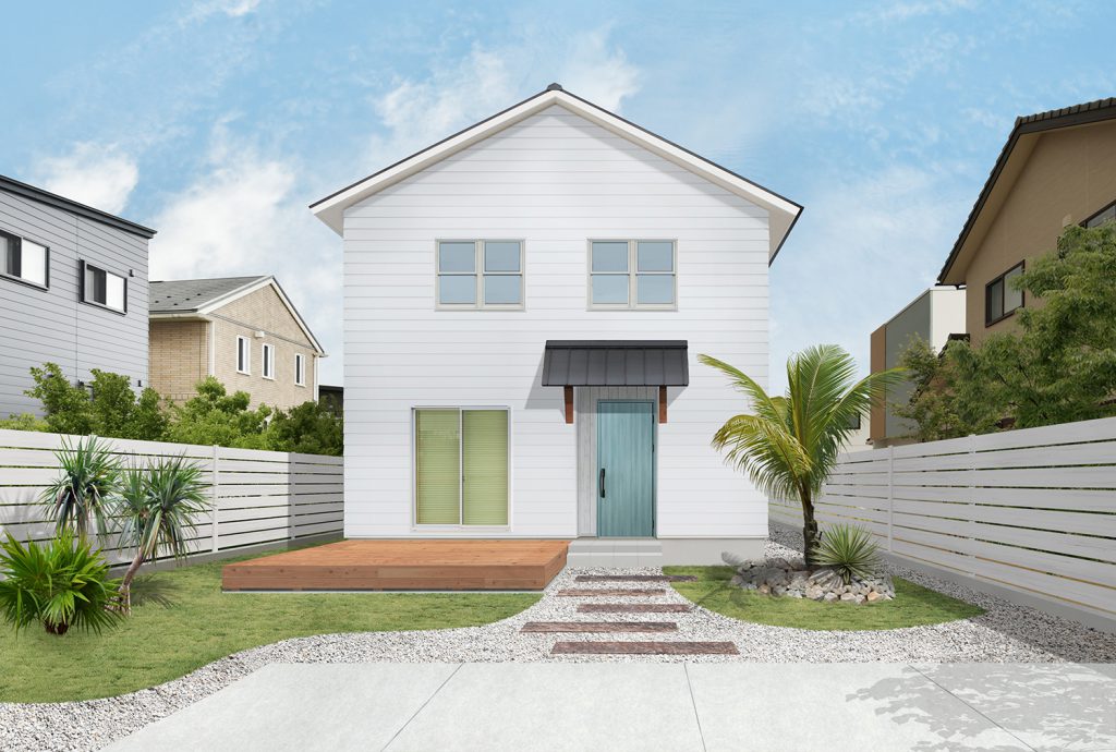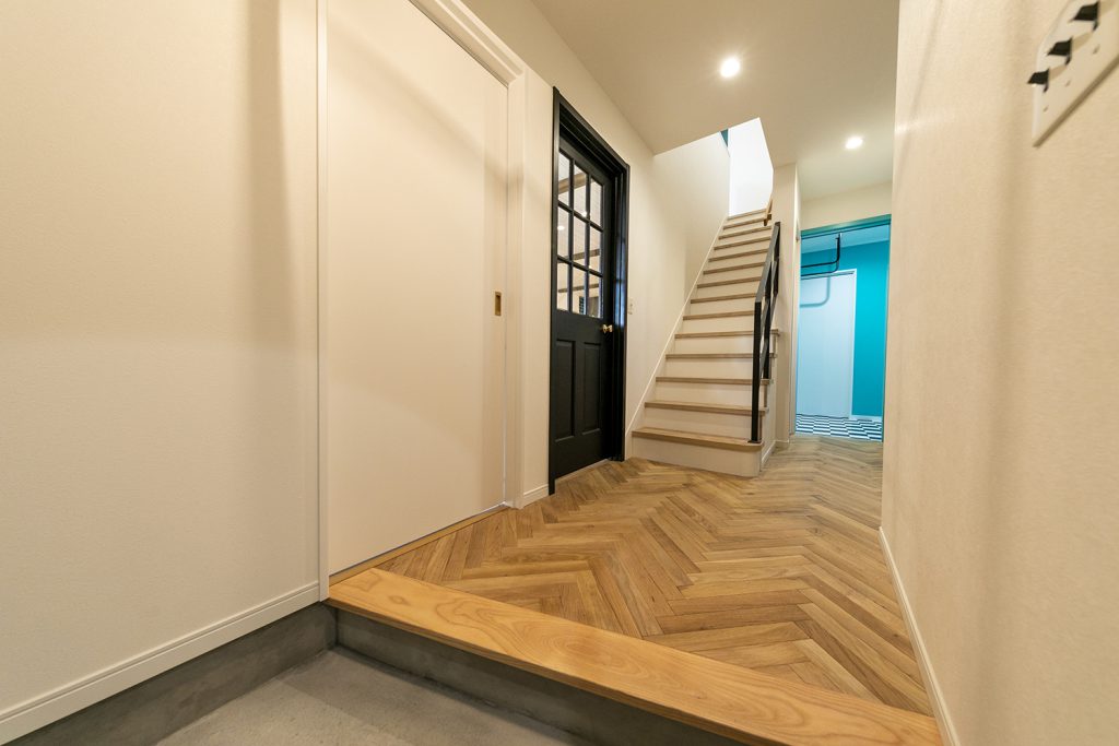 施工事例 I様邸 白い外観と三角屋根がかわいい住まい 外観は、三角屋根に白い外壁と水色のドア、 内観は、ヘリンボーン貼りの床やタイル貼り造作洗面など、 かわいい見所が満載。 玄関→ファミリークローゼット→洗面につながる帰宅動線にも注目!