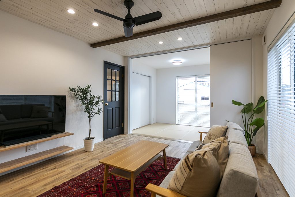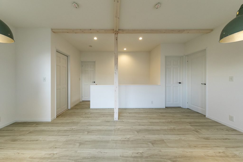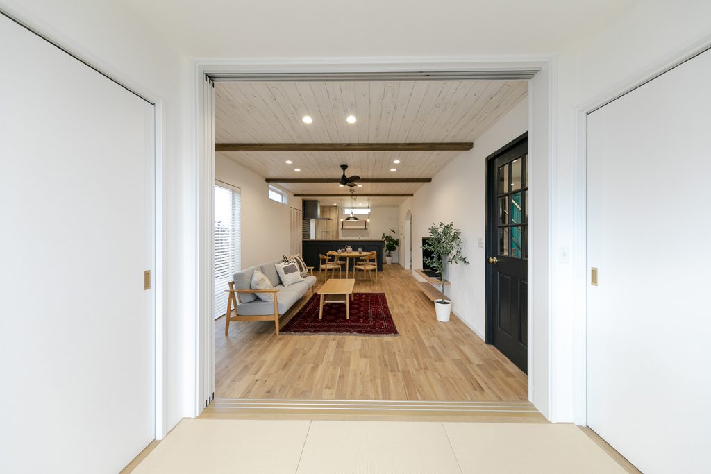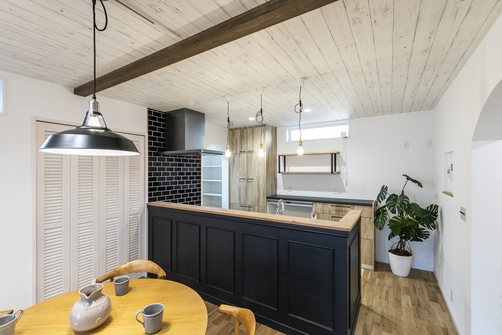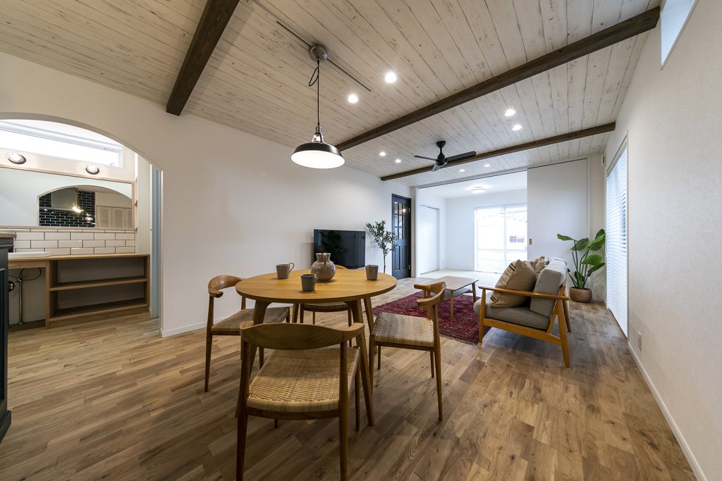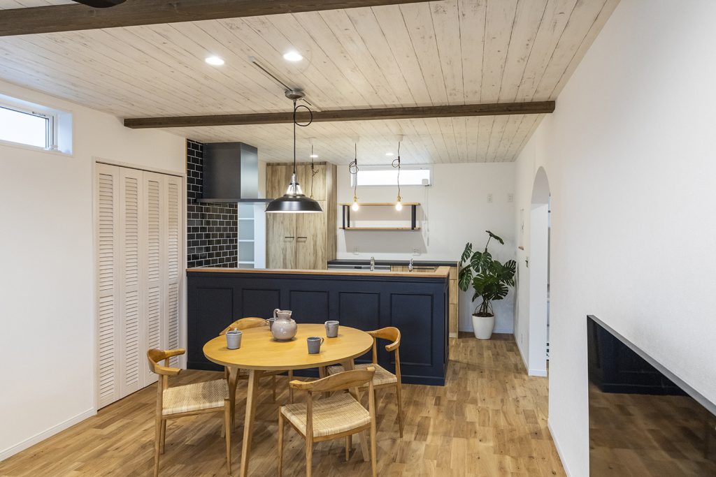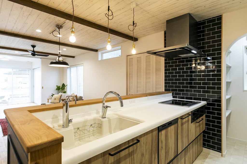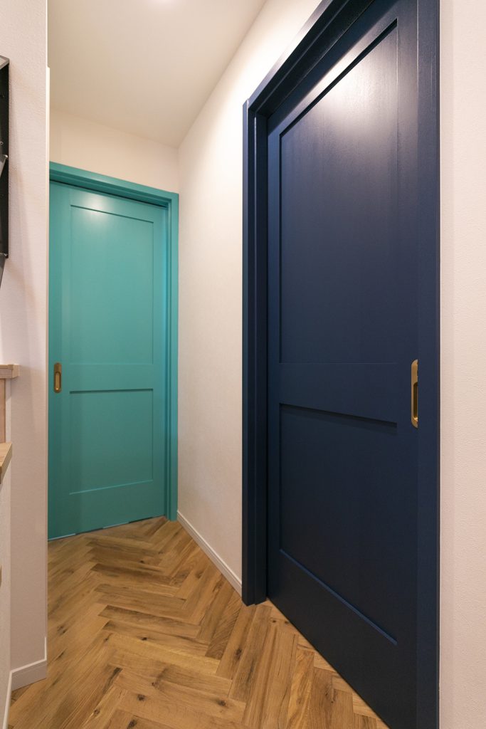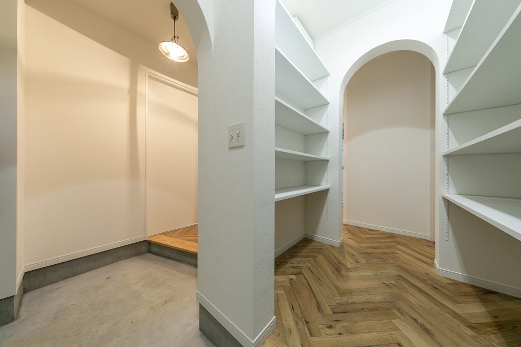 施工事例 I様邸 白い外観と三角屋根がかわいい住まい 外観は、三角屋根に白い外壁と水色のドア、 内観は、ヘリンボーン貼りの床やタイル貼り造作洗面など、 かわいい見所が満載。 玄関→ファミリークローゼット→洗面につながる帰宅動線にも注目!
