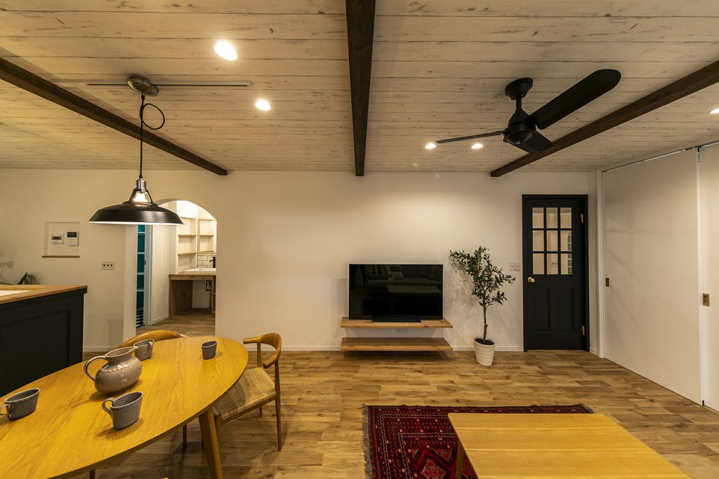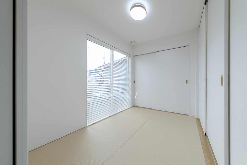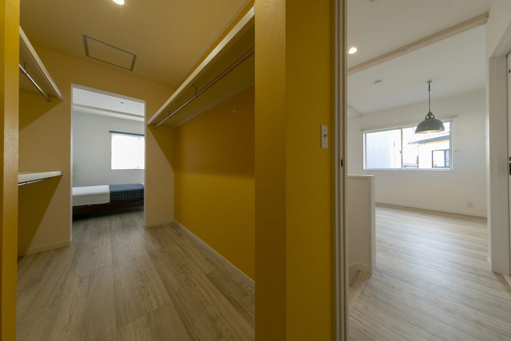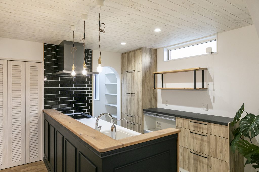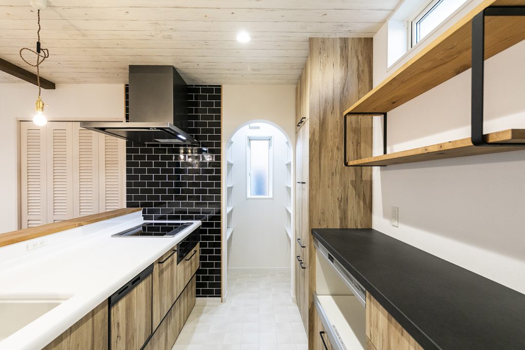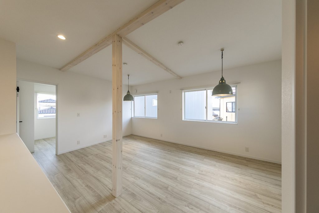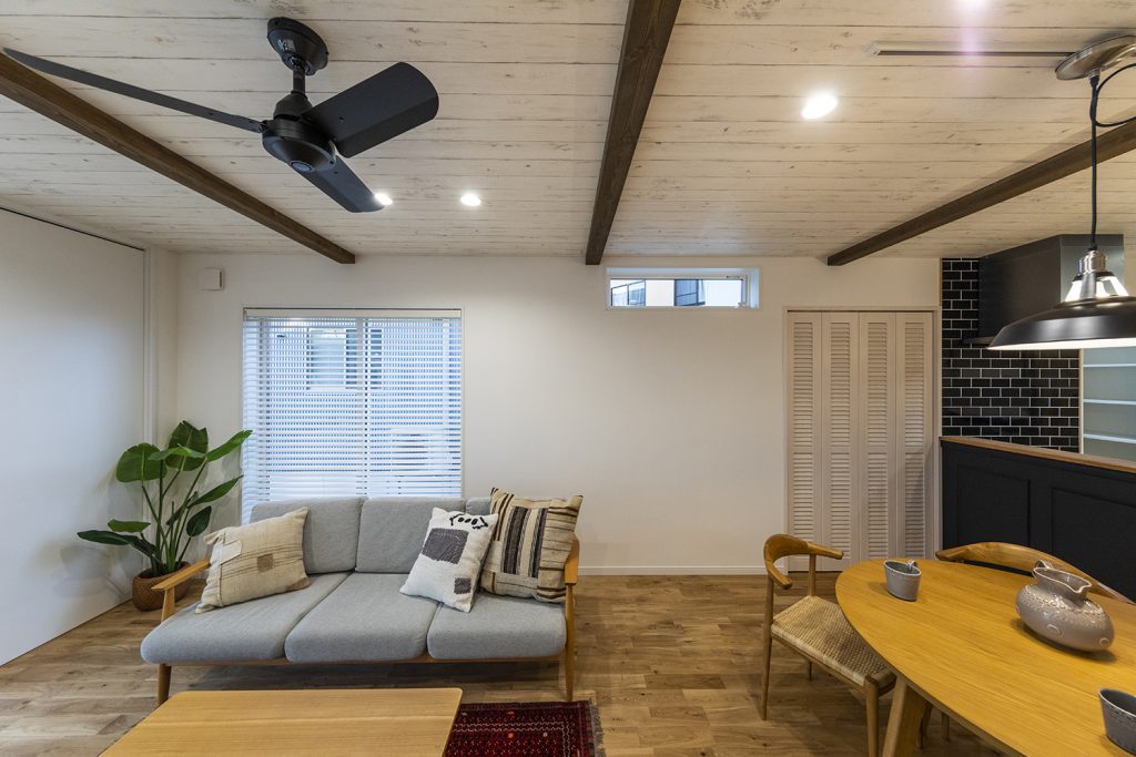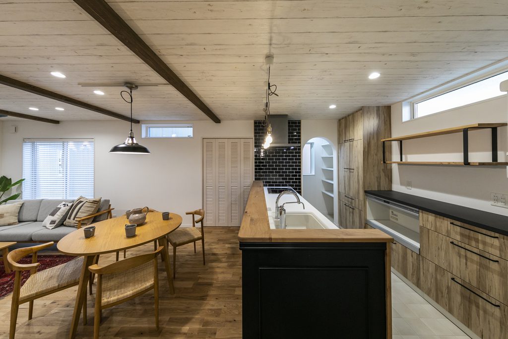 施工事例 I様邸 白い外観と三角屋根がかわいい住まい 外観は、三角屋根に白い外壁と水色のドア、 内観は、ヘリンボーン貼りの床やタイル貼り造作洗面など、 かわいい見所が満載。 玄関→ファミリークローゼット→洗面につながる帰宅動線にも注目!