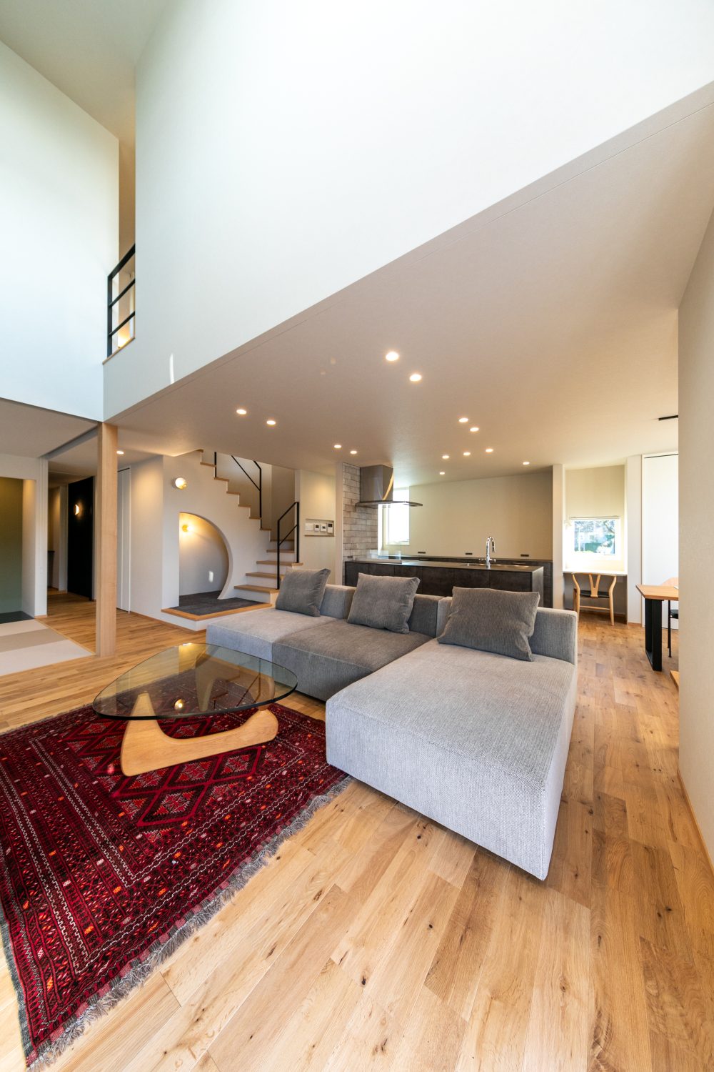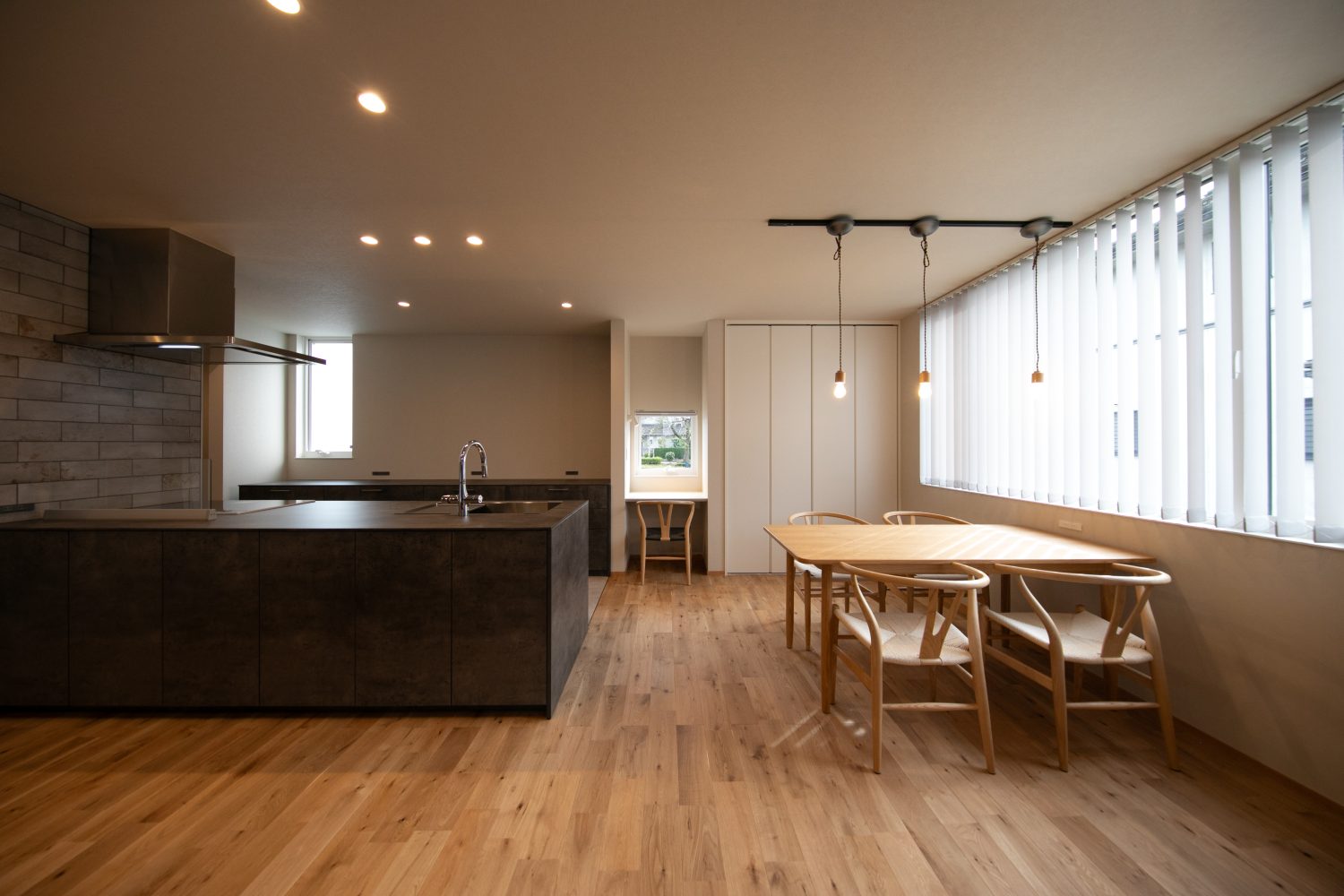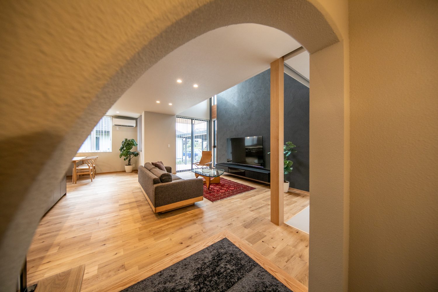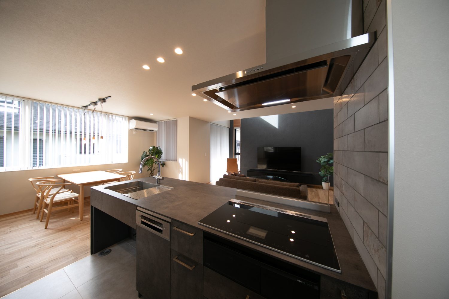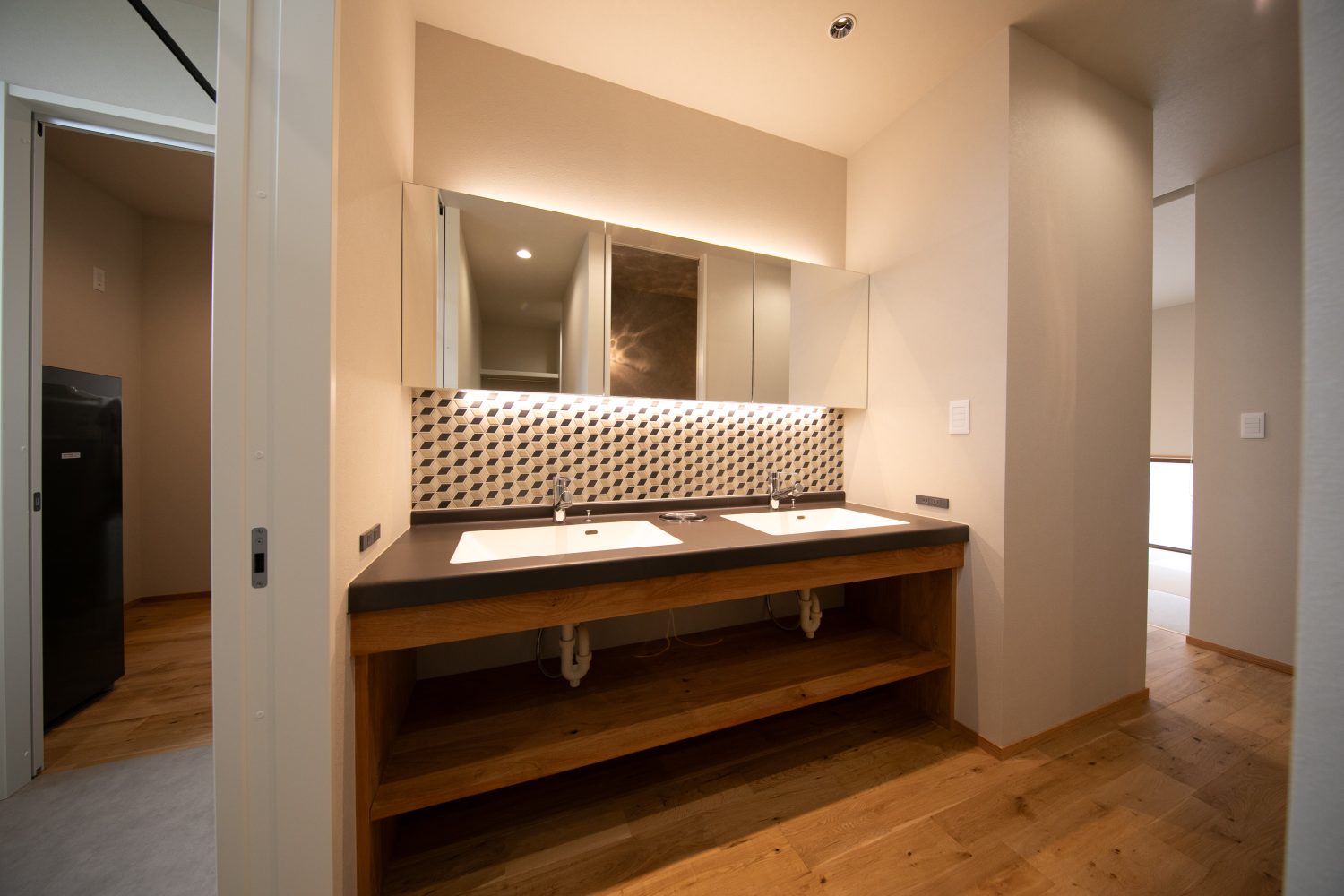 ■無垢フローリング、タイルやぬり壁を使用して、質感ある空間に。