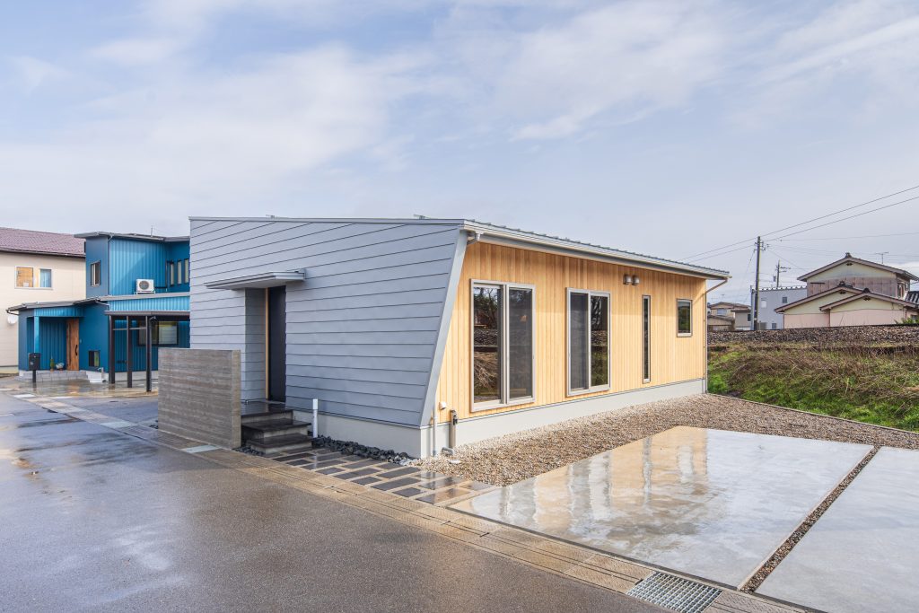 外観。スタイリッシュなガルバリウム鋼板と木を使ったの外観。メンテナンスのしやすさとデザイン性が両立。