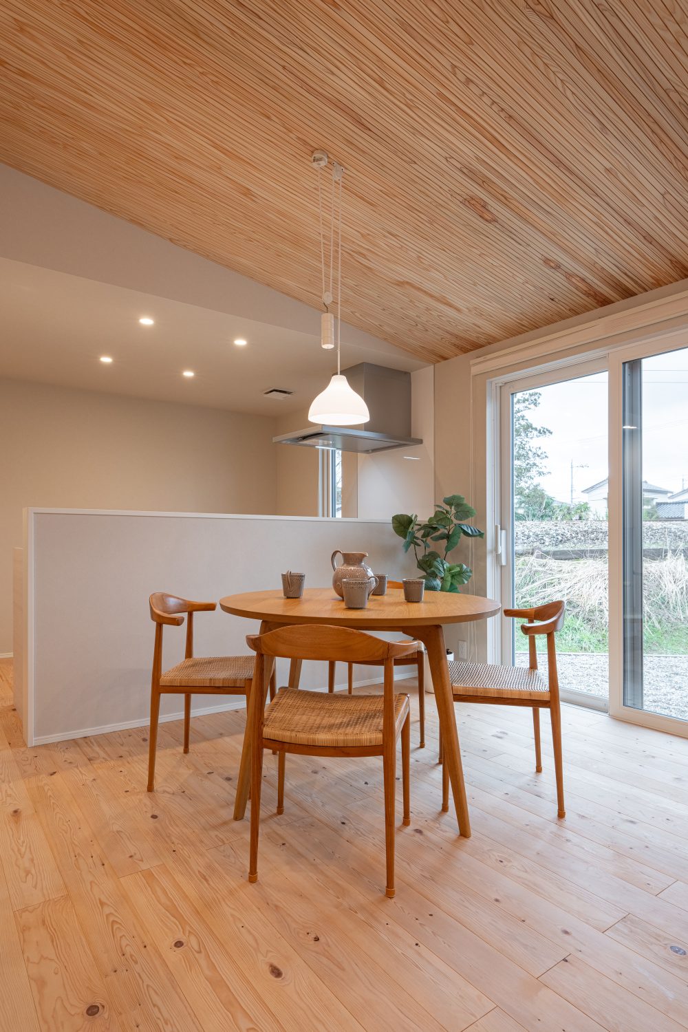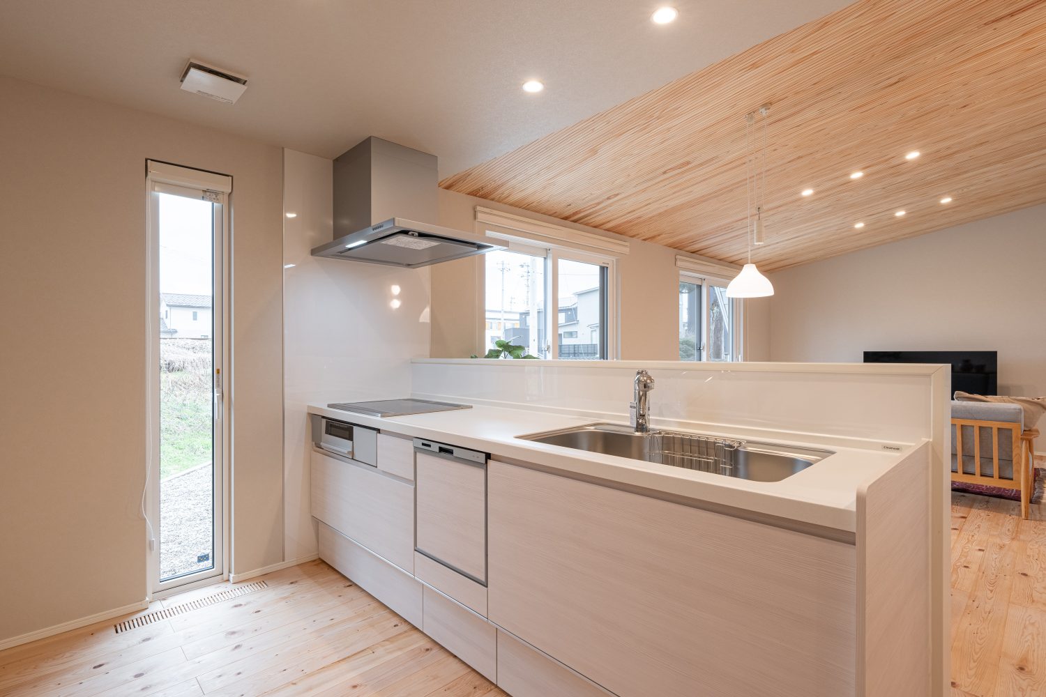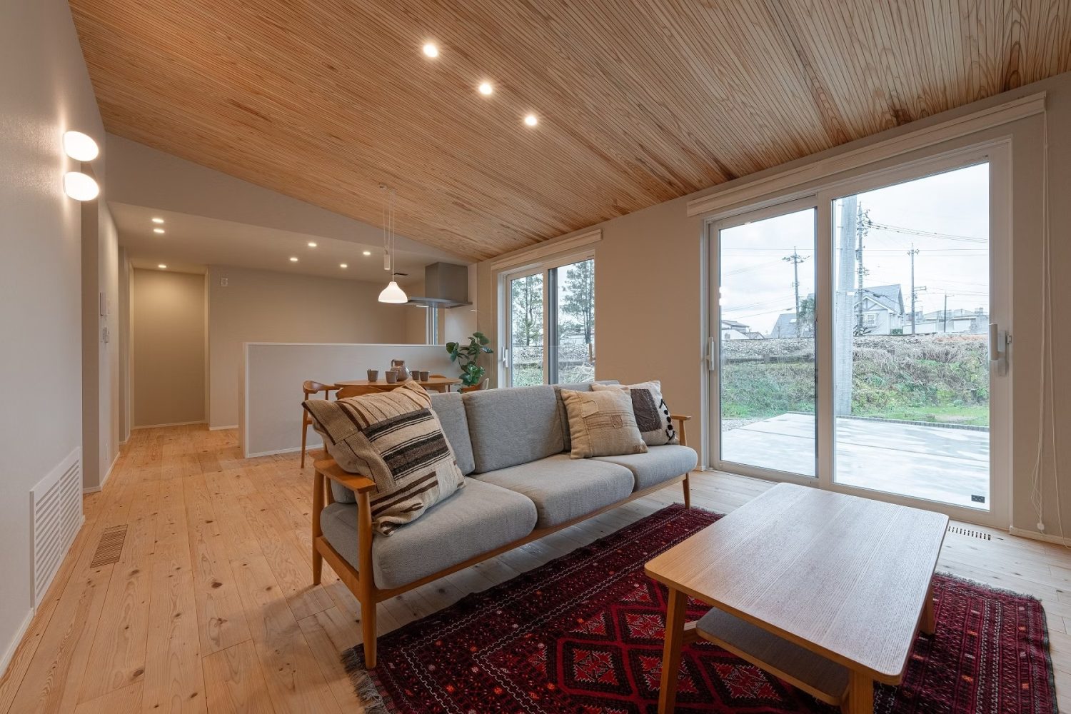 リビング。内装にはムク材を使用し、ナチュラルであたたかみのある雰囲気に。