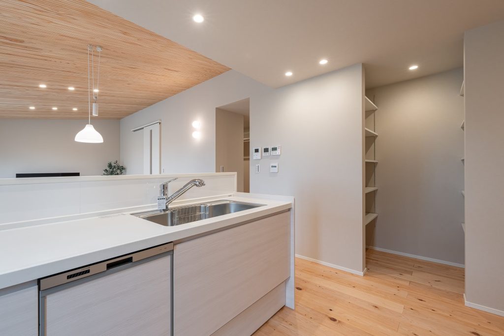キッチン。キッチン横にも大容量のパントリー