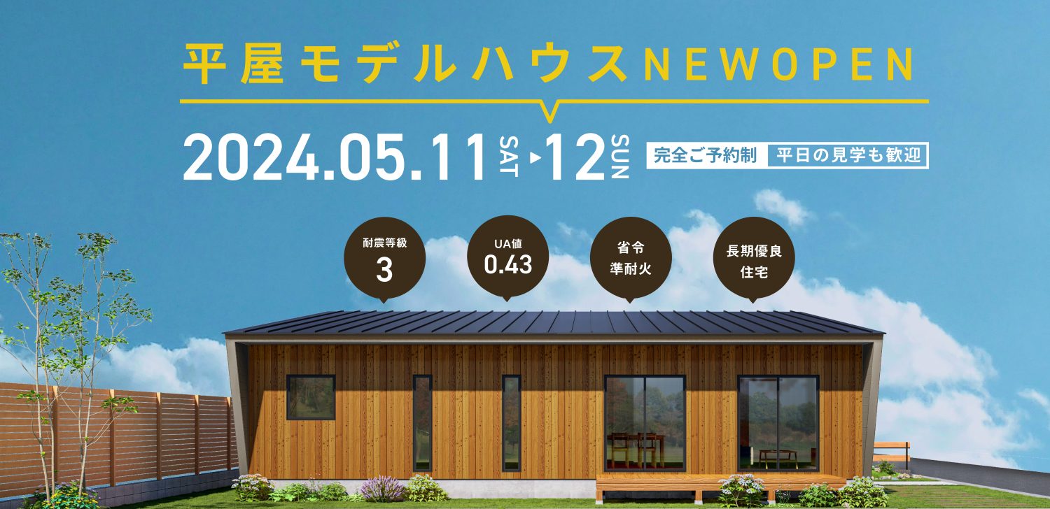 富山市婦中町袋に新しい平屋のモデルハウスがオープンします!もしもの災害にも安心の耐震等級3、冬の寒さや夏の暑さでも快適に暮らせる断熱等級6をクリアした高性能住宅をぜひ一度ご体感しにいらしてください。27坪のコンパクトな平屋で建築費を抑えつつ、20畳を超える広々LDKと便利な家事動線を叶えられる平屋となっております!