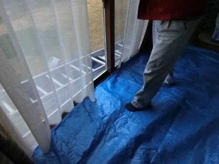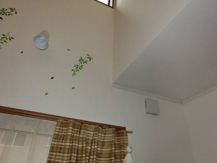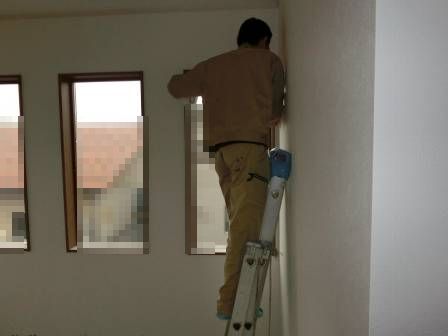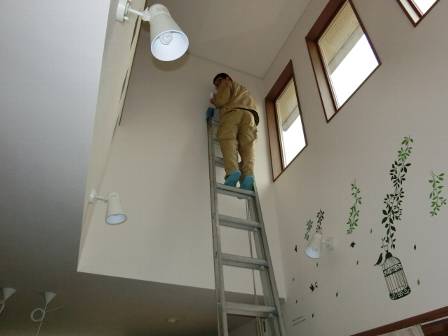 次に吹き抜けのクロスの隙間に対処。床に養生シートを敷いて、屋根点検用の長ハシゴをLDKで立てかける大掛かりな作業になりました。