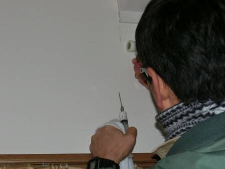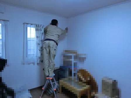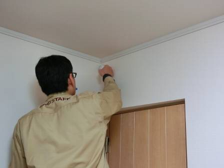A 現状を確認。今回はインテリアシンエイさんが同行されており、クロスの補修作業を手伝って頂きました。