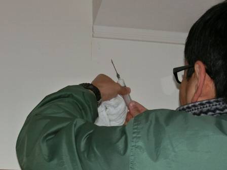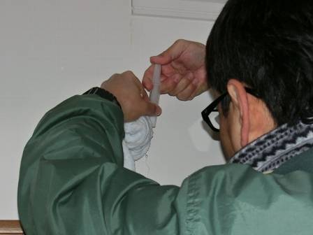 [注射器を使ってボンド剤を注入・ローラーやタオルで均等に均し作業]