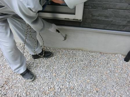A 現状を確認。細いヒビ割れが北側や西側に数箇所ありました。ハンマーで表面を軽く叩いて音を聞くことで内部が剥離しているか否かを検査しています。