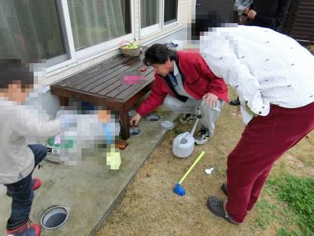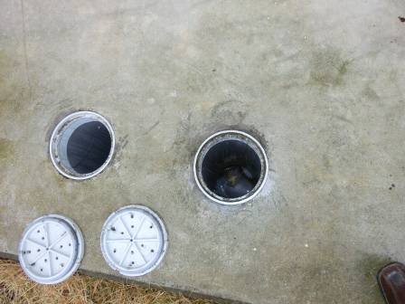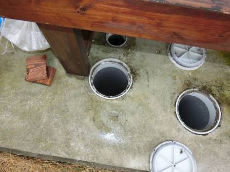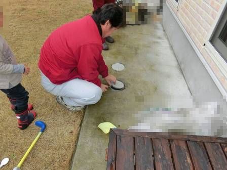 【汚水枡】2013年12月21日(土)お家の点検2年目(富山市婦中町N邸) 2014.02.28 汚水枡の点検を実施。 [建物後面/東側/キッチン等] この二つの汚水枡の蓋には細かな穴が開けられています。1年目点検のレポートを見てみると、エア抜き(配管内の排水の流れを円滑にする)している役割があると思われます。 白い油脂等の溜まりは特にありませんでした。 将来的な「詰まり現象」の原因となる油脂等の溜まりや汚れの堆積について説明。起こり得る現象の予防としてホースの水流で定期的に洗浄する方法を紹介。