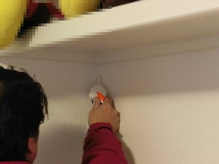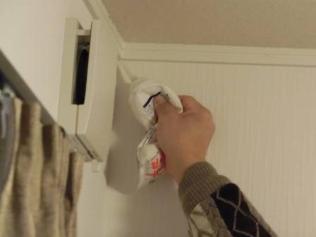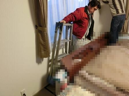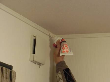 足元にベッドがあったので足場(脚立)を置けない点検スタッフを察してか、お客様がベッドに上って自らコークボンドを手に取り、慣れない手つきで補修・充填されていました。でも、やはりチューブタイプのコークボンドを片手で絞るのは使いにくいご様子。そこで、横窪が改めてお客様に代わって脚立を縦にして(渡辺が横から支えながら)コークボンドで補修しました。
