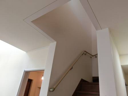 蓄暖で暖められた空気が吹き抜け天井に上昇する暖気と寒気・冷気が入れ替わる対流が起こっていると思われます。吹き抜けは開放感や2階との一体感等の良い点がある一方、暖房効率の悪さという欠点もあります。リビング階段はオシャレですが、冷たい空気が降りてくることもありますので、カーテン等で仕切ることが良いかもしれません。実際にこのような吹き抜け階段にカーテンレールをDIYで施工されているお客様もおられます。レールを施工する際にはシッカリと打ち込めるように下地の上にビスを打つことが必要になります。