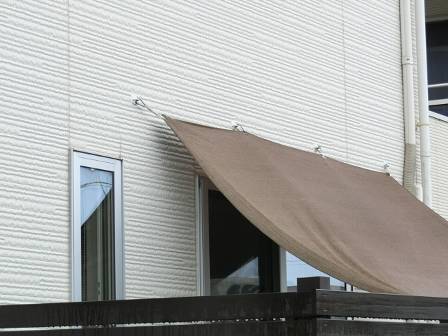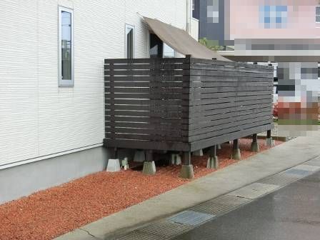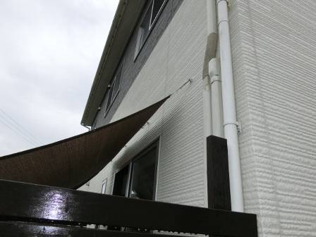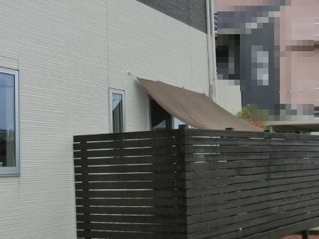 【お客様DIY/屋外編】2014年10月20日(月)お家の点検5年目(高岡市A邸) 2015.03.07 お客様DIYで施工されたデッキ。塀や足場の束石を見るとシッカリと安定した頑丈な作りになっています。木の塀で視線を遮っているので、気兼ねなくお食事タイムができるとご家族内で好評のようです。 [建物後面/南側] 雨除け?日除け?になっている手作りの屋根です。お客様曰く「外壁に穴を開ける際、どの場所にどんな長さ・種類のビスを使えば良いのか?穴を開けた跡の防水処理も必要だった等々」と当時のDIYによる施工を気恥ずかしげに語っておられました。 [建物後面/南側] [建物左面/東側]