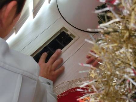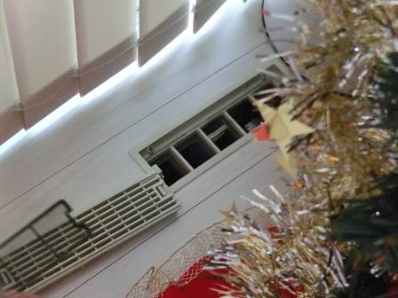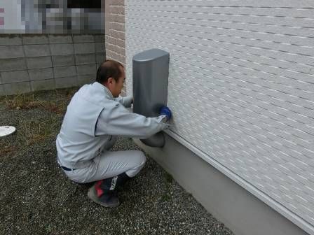 【エコアイ換気のフィルターの現状確認】2015年11月24日(火)お家の点検1年目(高岡市T邸) 2016.02.20 外部給気フィルターの状態を確認。 [建物左面/東側] 白いフィルターの外側にホコリ等が大量に付着して黒くなっています。約1年間のエコアイ換気の運転でこの汚れを見ると外の空気の汚れ度合いが想像できます。給気の流れは特に異常ありません。 給気口のカバーを開けるとホコリが少し溜まっていたのでお掃除して頂くようお願いしました。 [LDK/給気口] 排気口の白いフィルターはお客様がお手入れされていました。 [洗面脱衣室/排気口] [1階トイレ/排気口]