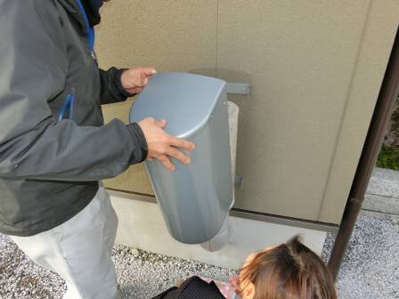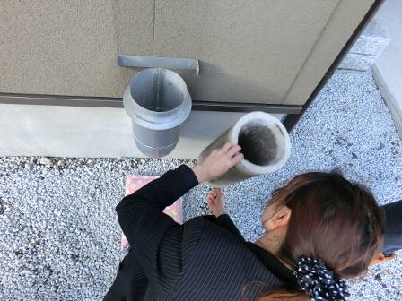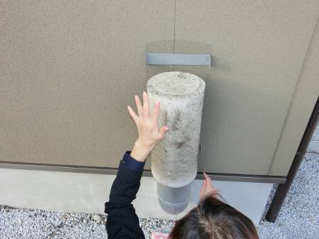 【エコアイ換気のフィルター交換】2015年2月20日(金)お家の点検1年目(魚津市M邸) 2016.02.18 Q フィルターを交換したいのだが、どのようにすれば良いのか? A 外部給気口の両サイドのネジを回してカバーを取ると、白い円筒形のフィルターがあります。 今回はお客様にも白いフィルターの汚れ具合を見て頂きました。取替え用のフィルターは無かったので、お掃除をお勧めしてそのまま元に戻しました。 これは室内にいくつもある排気口です。円筒の部品を取り外して中に入っている円形のフィルターの取り外し方法を説明しています。