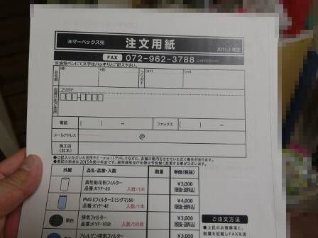 また、室内排気用のフィルターが洗いすぎ?でボロボロになってきたとのこと。そこで、FAX注文用紙(ネットでは㈱マーベックスのサイト)をお渡しして必要の際には購入して頂くようお願いしました。