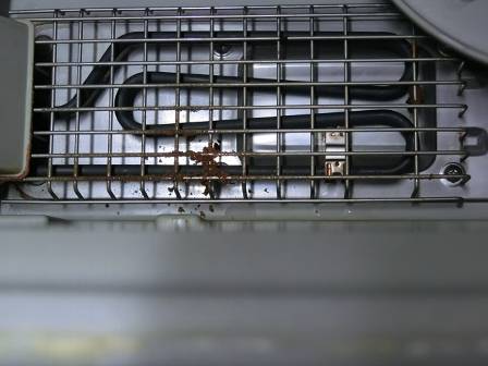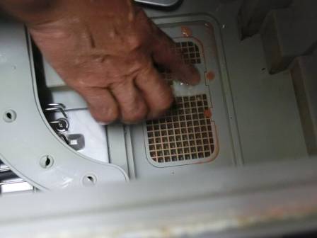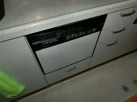 現状を確認。新築から10年経ってもお客様宅の食洗機はまだまだ現役バリバリです。排水しにくいとのことなので食器整理棚を取り外してみるとステンレスカバーに油カスがこびり付いていました。お客様のお話では最近になってよく見られる現象のようです。