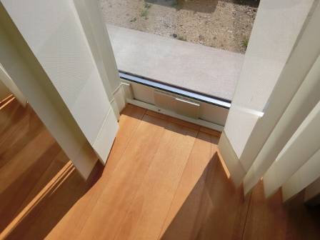 床暖房は寒い時期には一日中点けっ放しとのことです。サッシ枠にはエコカラットが結露防止用に取り付けられていました。夜になると厚手のカーテンを敷くことで空気の対流がカーテンによって遮られて、サッシ枠の温度が下がることで結露化しやすい環境になる事例を紹介。