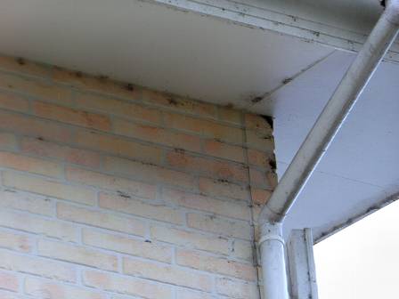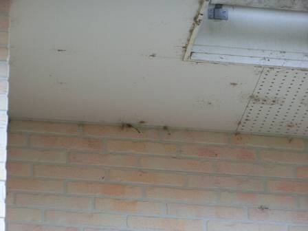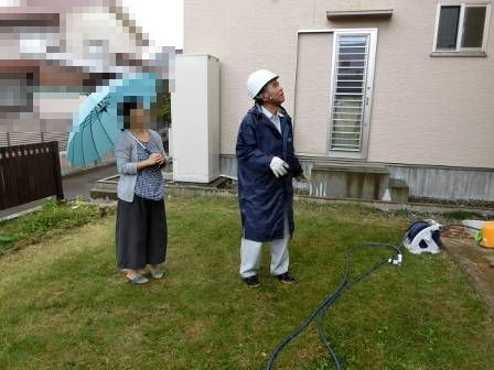 【クモの巣】2016年11月1日(火)お家の点検5年目(富山市婦中町N邸) 2017.03.04 軒と外壁の境目周辺にはクモの巣が数多く見受けられました。 [建物後面/東側] お客様はホースの水流を当ててクモの巣を取り除いているご様子。軒下には有孔ボード(小屋裏換気)が張ってあるのでホースから出る水の圧力によって水が進入する可能性もあります。そこで、水ではなく長い柄の棒でお掃除して頂くようお願いしました。また、夜になると軒下にはコウモリがいるようで、クモを捕食しているそうです。