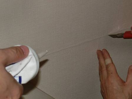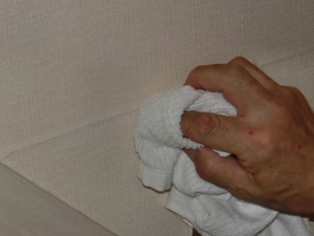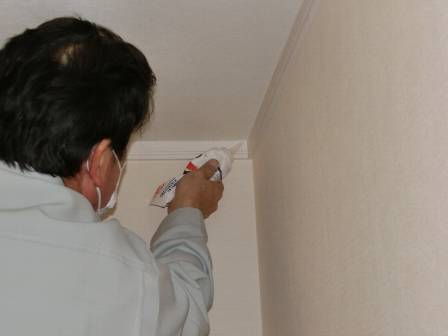 開けた切れ目にコークボンドを充填して、はみ出たコークボンドを濡れタオルで拭き取りします。