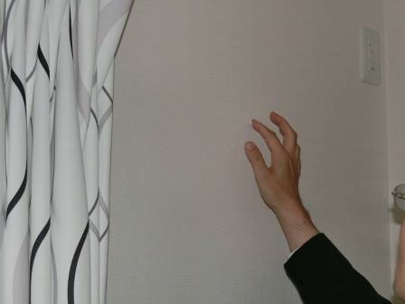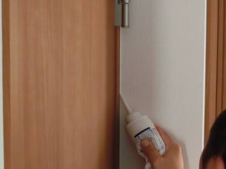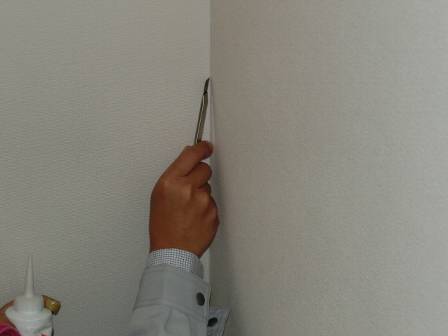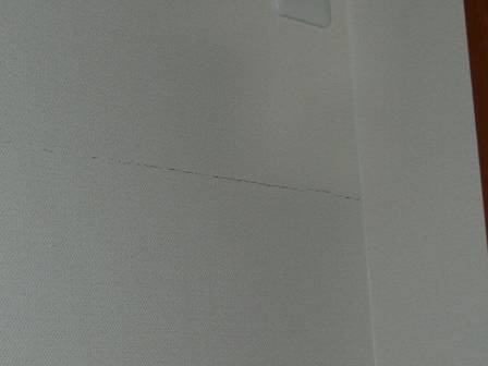 A 現状を確認。下地ボードのジョイントになっている部分のクロスに変化が起こっている状態です。構造的な異常ではないのですが、湿度変化等で木部が伸縮することで下地ボードが少し動き、上に貼ってあるクロスが追随できずにヒビ割れしてしまう現象となります。
