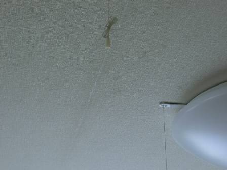 【クロスの補修跡】2014年8月11日(月)お家の点検10年目(富山市Y邸) 2015.03.07 天井クロス同士の間を見ると、コークボンドの乾いた白く透明な補修跡が太陽光で反射していました。お客様が5年目点検後にDIYでクロスの隙間にコークボンドを充填していたそうで(5年目点検で助言)、お客様はクロスの経年変化についても理解されていました。 [2階居室]