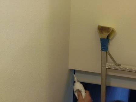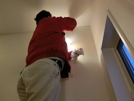 【クロスの隙間】2013年12月14日(土)お家の点検2年目(高岡市O邸) 2014.02.28 Q クロスに隙間がある。 A 現状を確認。階段口から2階居室に至るまでのクロスの隙間等にコークボンドを充填。今回も脚立の脚バランスが悪いので、渡辺の足の甲に脚立の脚を乗っけてバランスを取っています。 [階段口/踊り場上部] [階段口/踊り場] [階段口/1階入口付近]