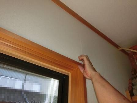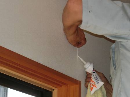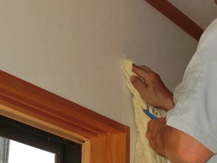 【クロスの隙間】2014年9月18日(木)お家の点検10年目(高岡市T邸) 2015.03.07 クロスの一部が剥がれているのを発見。 [リビング] 今回はアフターサービスの一環で壁クロスの剥がれ箇所にコークボンドを充填して隙間を目立たないように補修しました。 [コークボンド充填&はみ出た部分は濡れタオルで拭き取り]