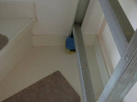 2階ホールから寝室への短い階段は曲がっているので、脚立をバランスよく置くことができません。そこで、脚立の脚の3点は階段桁に置いて、残りの1点は足の甲にしました。非常に痛かったのですが、安全第一ということで・・・(汗)
