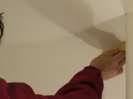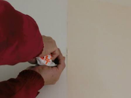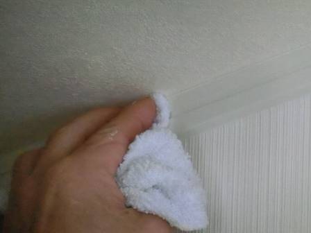 現状を確認。下地ボードのジョイント部分(クロスが左右に引っ張られている)であり、タオルで擦るとクロスのヒビ割れが分かる様子。コークボンドで調色しながら補修(一般的にはクリアかホワイトのコークボンド)という方法もありますが、補修跡が逆に目立ってしまうこともあります。お客様との協議の結果、このままの状態を理解して頂きました。