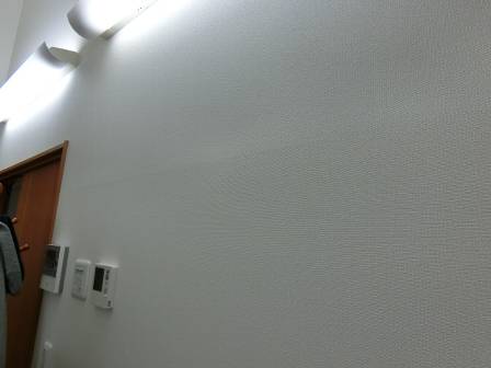 壁面にクロスの浮き現象が見受けられました。太陽光ではなく室内照明で照らされると分かりやすくなります。この現象は下地ボードのジョイント部分であり、湿度変化による下地材(木部)の伸縮に伴ってクロスが変化してきたものであり、一般的なご家庭でも起こり得る現象となります。この状態でも構造上問題ないので説明・他の事例を紹介しながら納得して頂きました。