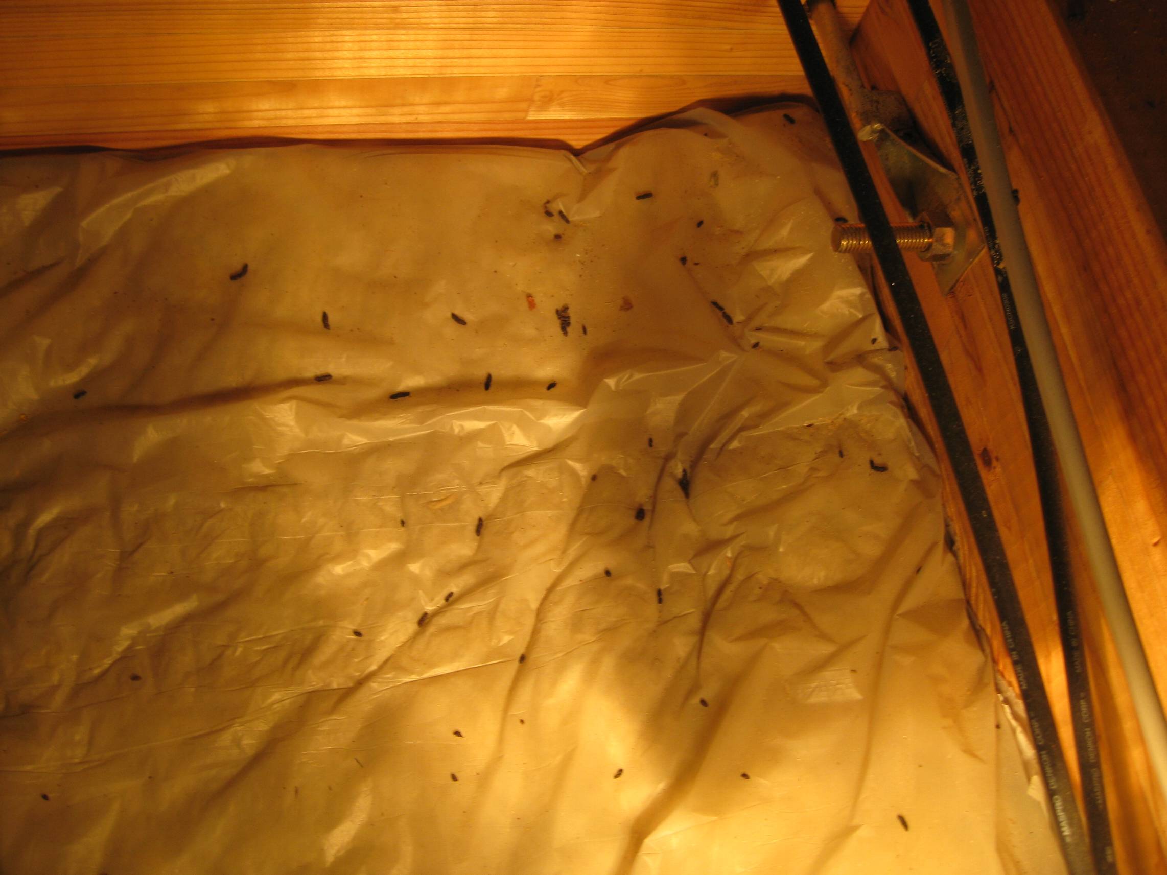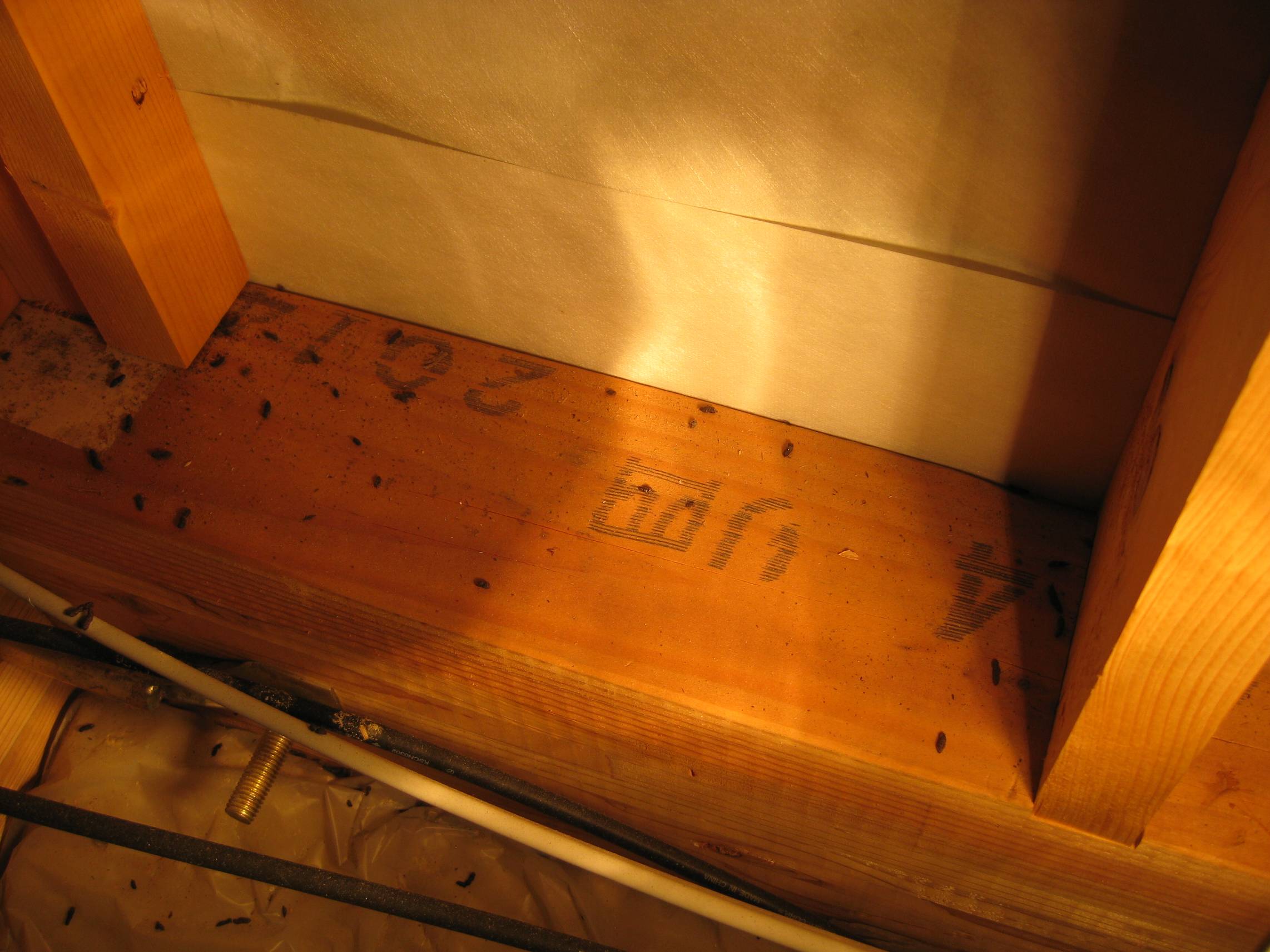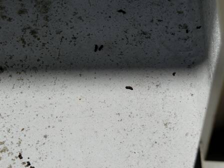 【コウモリのフン】2014年5月17日(土)お家の点検5年目(滑川市O邸) 2014.06.19 小屋裏点検の際にコウモリのフンを発見。 [小屋裏] ベランダにもコウモリのフンがありました。お客様に確認すると、「コウモリの進入は分からないが、近くを飛んでいるのは知っている」とのこと。また、コウモリは鳥獣保護に指定されているので、弊社での点検現場での事例を紹介し、駆除ではなく近寄らせない工夫が必要になると助言。 (参考サイト/コウモリ防除と対策/http://mushi-chisiki.com/pest/koumori.html) [ベランダ]