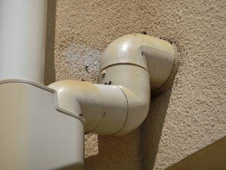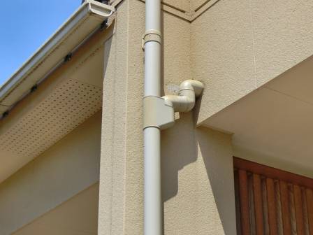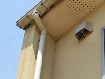 コウモリが止まりやすいのか、樋の上や周辺にはフンや尿の白い跡があるようです。過去に進入口となったベンドキャップは現在進入防止が施されています。