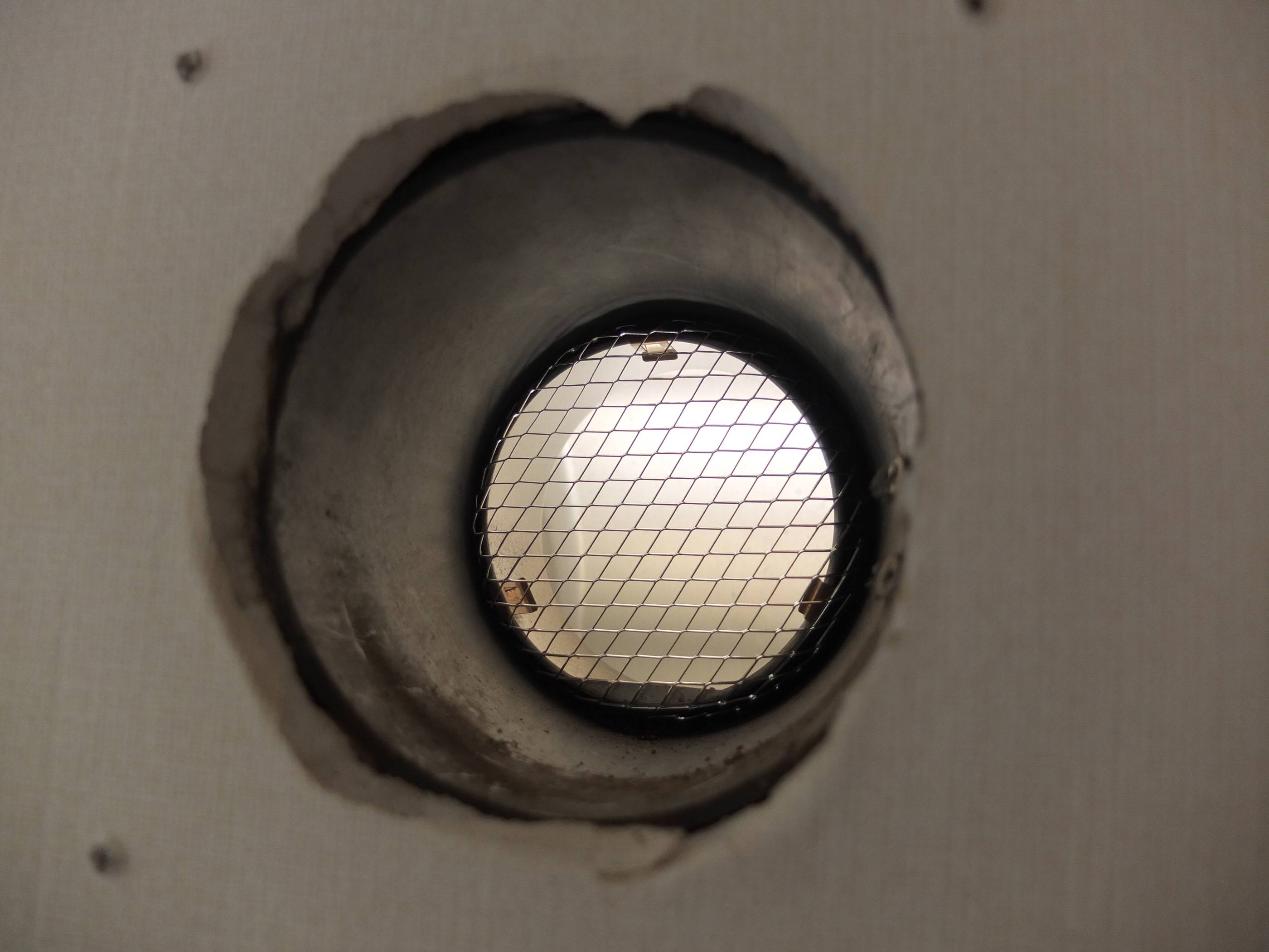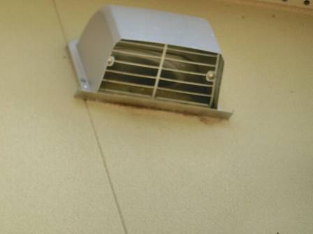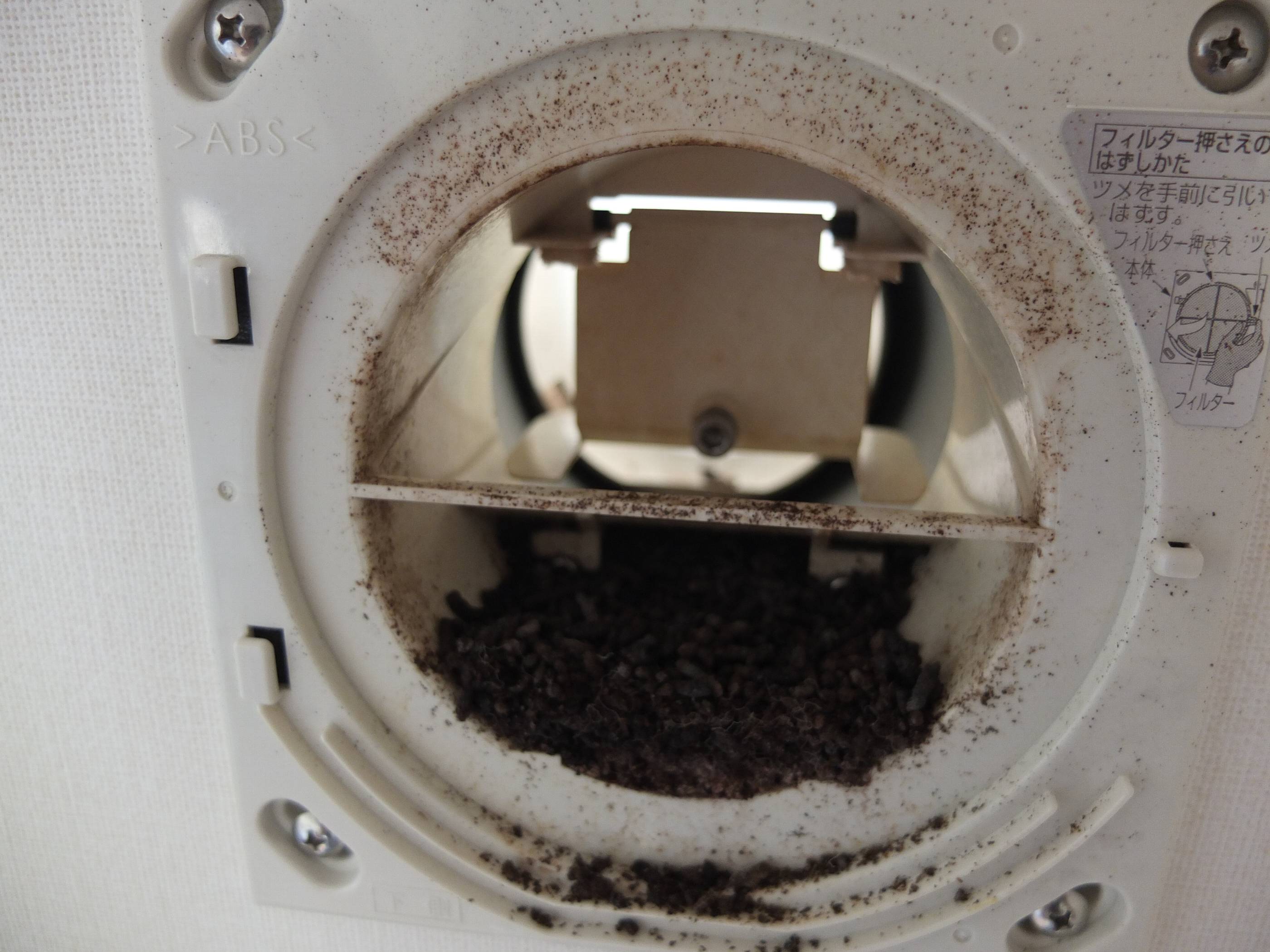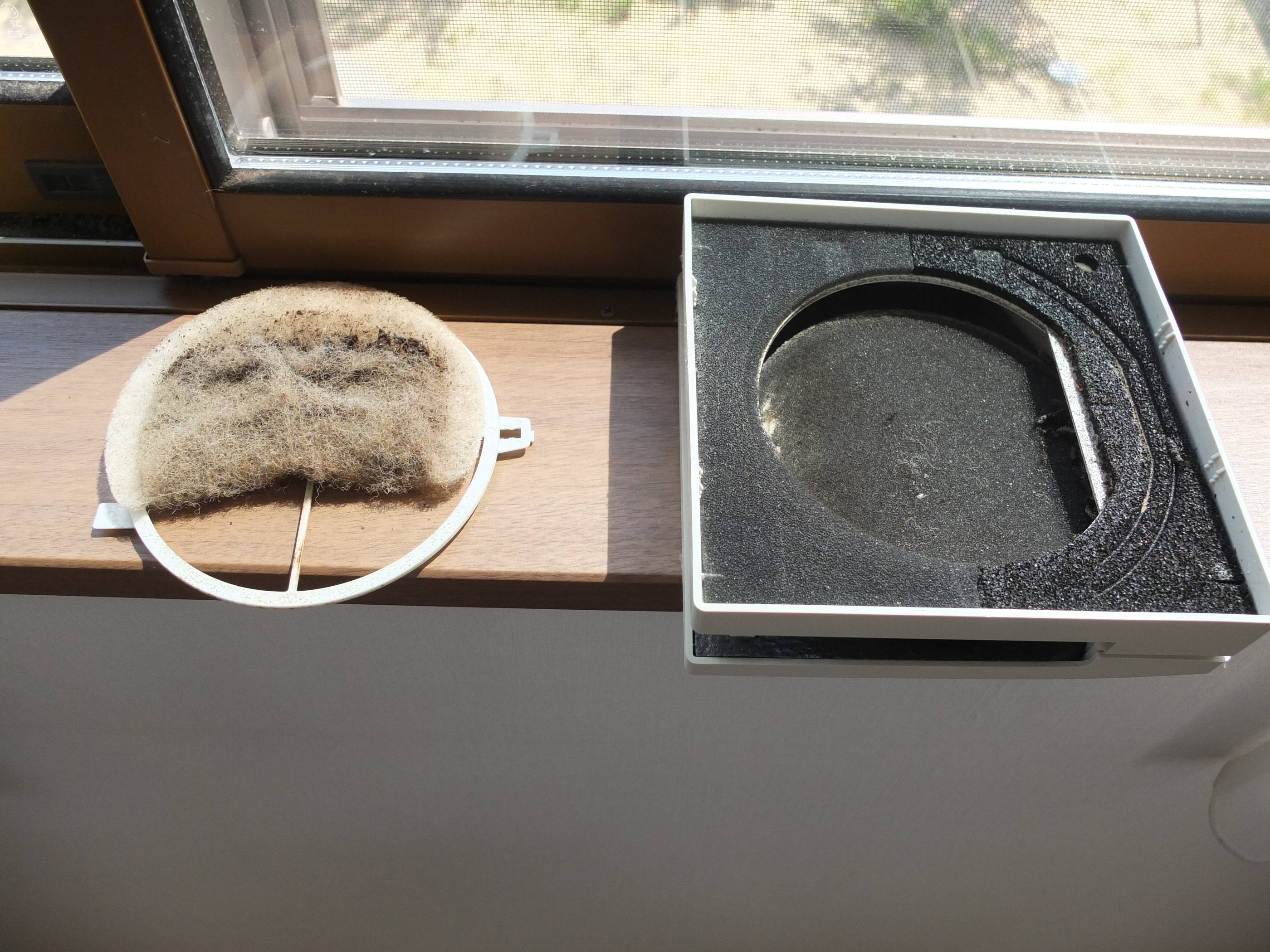 これは2014年8月にお客様からのコウモリ被害の申し出があって対処したものです。各部屋の外壁側には換気をするために給気口が設置されているのですが、この穴を通ってコウモリが外から入ってきたようです。外部へと通じる穴の中を見てみると、黒いフン?が溜まっているのが分かります。スポンジフィルターも汚れていました。