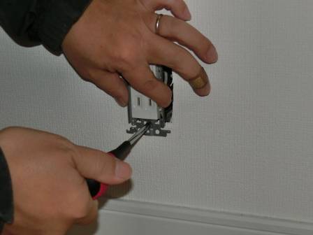 A 現状を確認。いったんコンセントカバーを外してドライバーでコンセント部材の傾きを補正します。一見、簡単そうに見えますが、少し度胸がいる作業。危ないので、真似しないほうが良いと思います。
