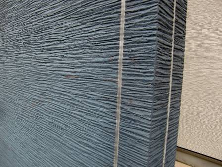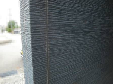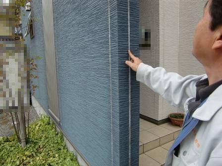 【コーキングの経年変化】2013年10月23日(水)お家の点検5年目(富山市O邸) 2014.02.26 方角(太陽光の当たり具合)による劣化進度の違い。太陽光がよく当たる西側(外側)は内側(日陰)の状態を比較すると、コーキング(シーリング)の経年変化(白く硬化)が進んでいるのが分かります。