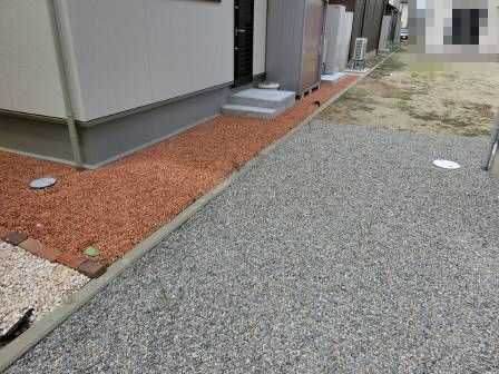 エコアイ換気が施されている基礎仕様。従来のような基礎内ではシロアリ防除・薬剤散布・塗布ができない構造(キレイな空気の換気優先/エコアイ換気)となっているので、周囲にステーション(※)を埋設しています。現在、外構は防草シートの上に砂利が敷かれていますが、薬剤交換という5年目以降の掘り返しに少し手間がかかるかもしれません。