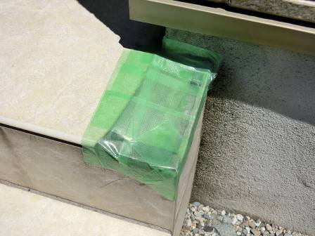 ヒビ割れした箇所を取り外して同じ品番のタイルを探すことになりました。養生テープを貼って雨水が中にしみ込まないように配慮。