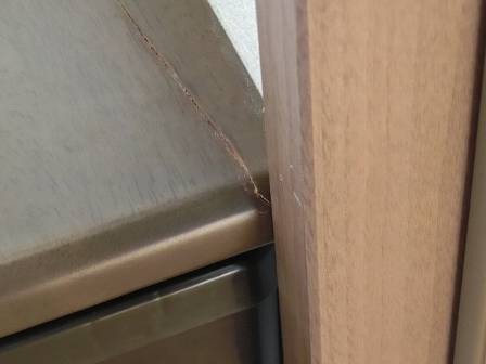 天板の下側にはヒビ割れが至っていない状態。天板と壁の施工方法もあるので、補修には建具屋さんに相談することになりました。