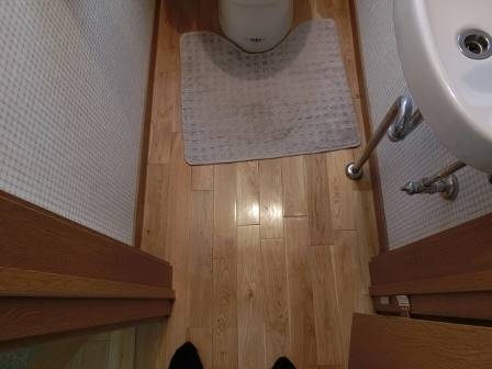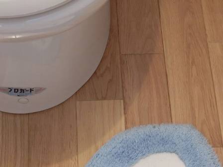 1階、2階は無垢材の単層フローリング仕様であり、ビニール製のクッションフロアと違って、汚れにくく木目の色合いや雰囲気は非常に良いと思われます。ただし、木は水に弱いので便器やトイレタンクに発生する結露水に対して日頃の拭き掃除やワックス等のメンテナンスに心がけること、結露が発生しやすい時期はトイレ内の換気扇をつけて空気を循環させること、等々に気をつけて頂ければ床材の変色現象は発生しにくくなると思われます。