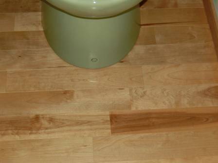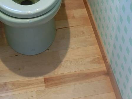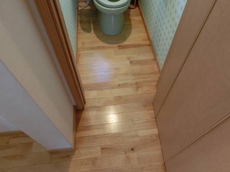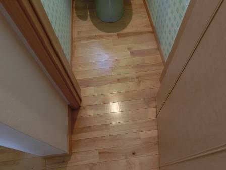 【トイレの床】2014年5月19日(月)お家の点検10年目(富山市K邸) 2014.06.22 トイレの床材は無垢材の単層フローリング仕様です。便器やトイレタンクに発生する結露水が床材に浸透する変色現象は特に見受けられませんでした。お手入れが行き届いているのかハッキリとは分かりませんが、普段から気をつけておられるものと思われます。 [1階] [2階]
