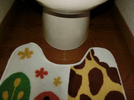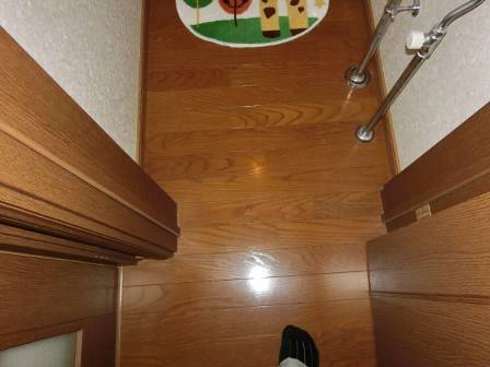 【トイレの床材】2014年9月18日(木)お家の点検10年目(高岡市T邸) 2015.03.07 床材は木製フローリング仕様。ビニール製のクッションフロアに比べて汚れには強いのですが、水分には弱い性質があります。便器やトイレタンク周りは季節によって結露が発生し、その結露水が床に垂れて床材が変色する事例もあります。便器周りには結露吸収シートが貼ってありました。 [1階] [2階] ダイニングの床には年に1回程度ですが、リンレイ製のワックスをかけておられるご様子。そこで、トイレの床材にもダイニングと同様にワックスをかけて耐水性を持たせて頂くようお願いしました。